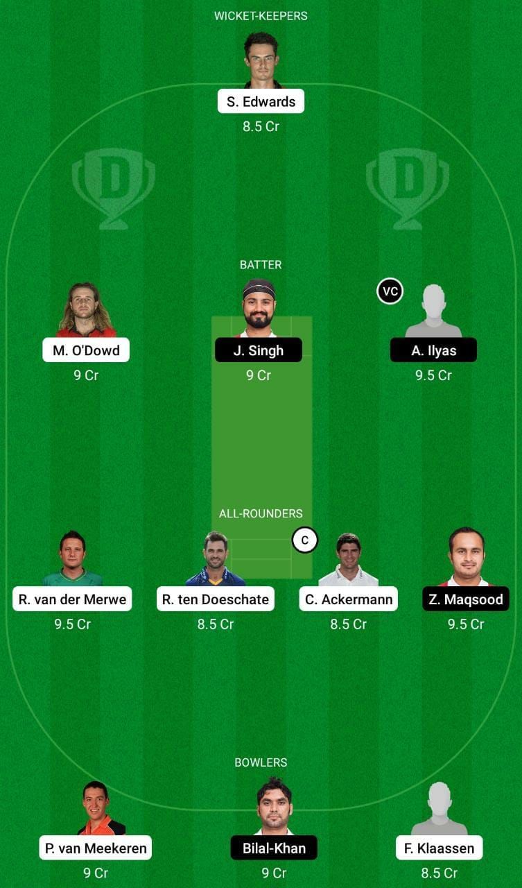 Fantasy Suggestion #2: S Edwards, M O'Dowd, J Singh, A Ilyas, R van der Merwe, R ten Doeschate, C Ackermann, Z Maqsood, P van Meekeren, B Khan and F Klaassen