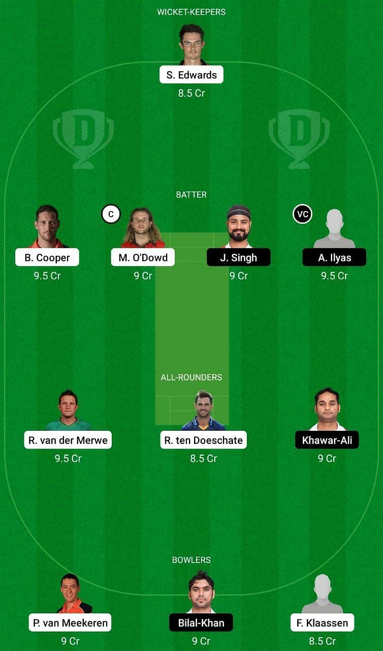Fantasy Suggestion #1: S Edwards, B Cooper, M O'Dowd, J Singh, A Ilyas, R van der Merwe, R ten Doeschate, K Ali, P van Meekeren, B Khan and F Klaassen
