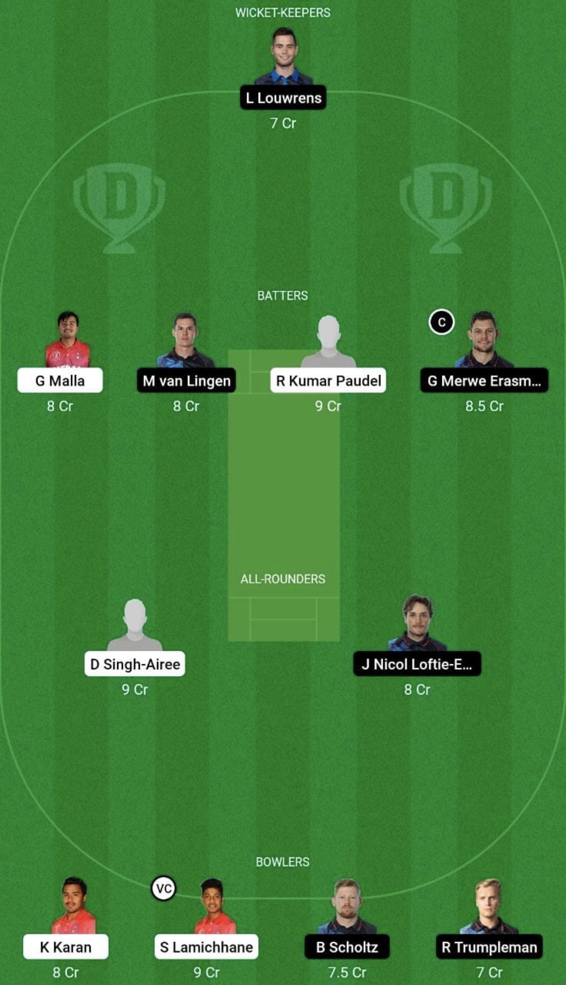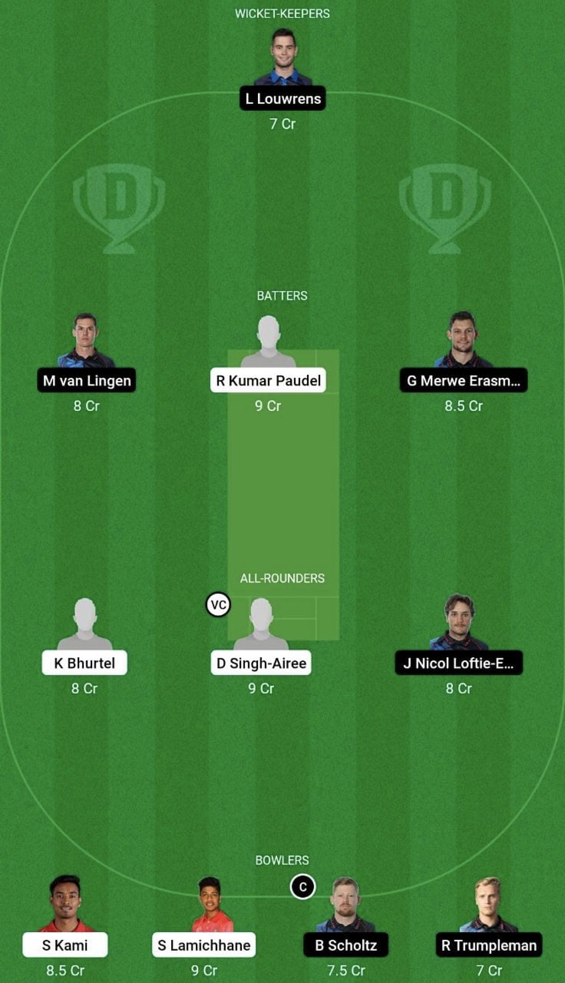 Bowlers: KC Karan, Sandeep Lamichhane (vc), Bernard Scholtz, Ruben Trumpelmann