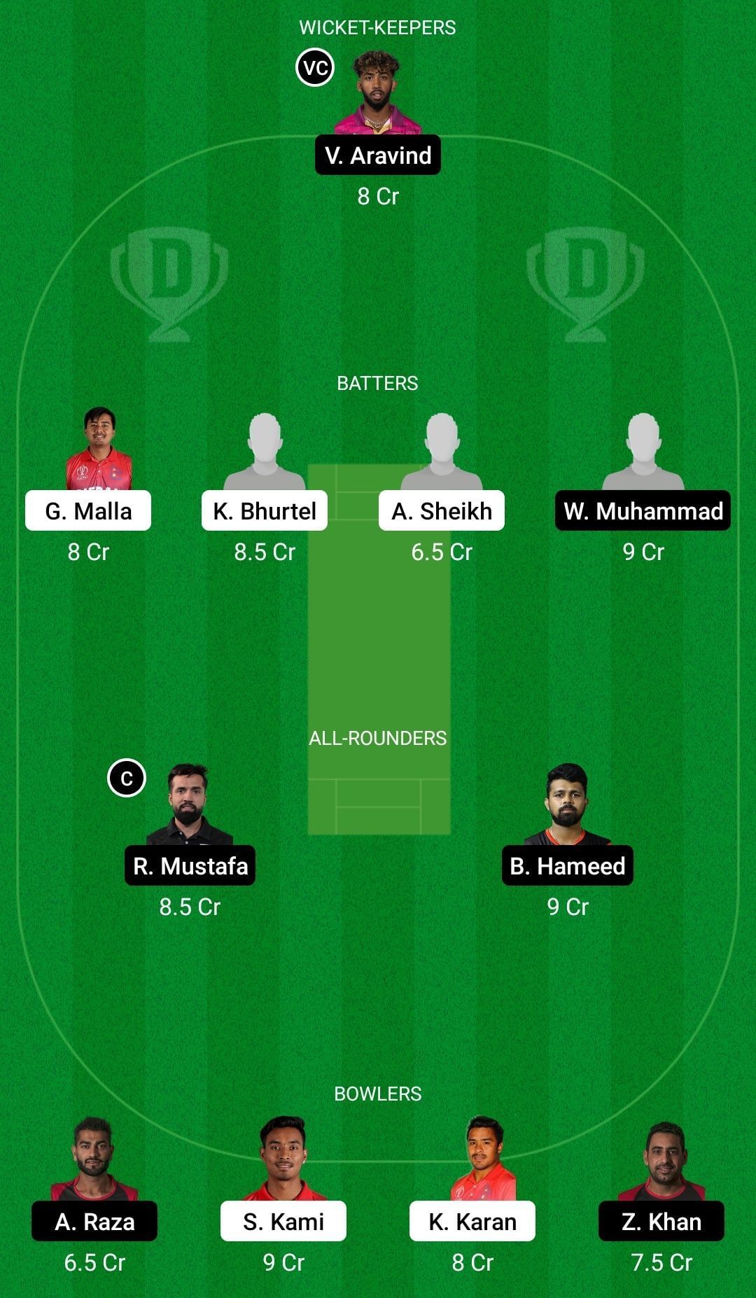 An all-round side might be the best option for this game. All-rounders and bowlers might be the top captaincy options. Thus, the likes of Rohan Mustafa, Basil Hameed, Sompal Kami, Karan KC and Zahoor Khan will be the ones to watch out for.