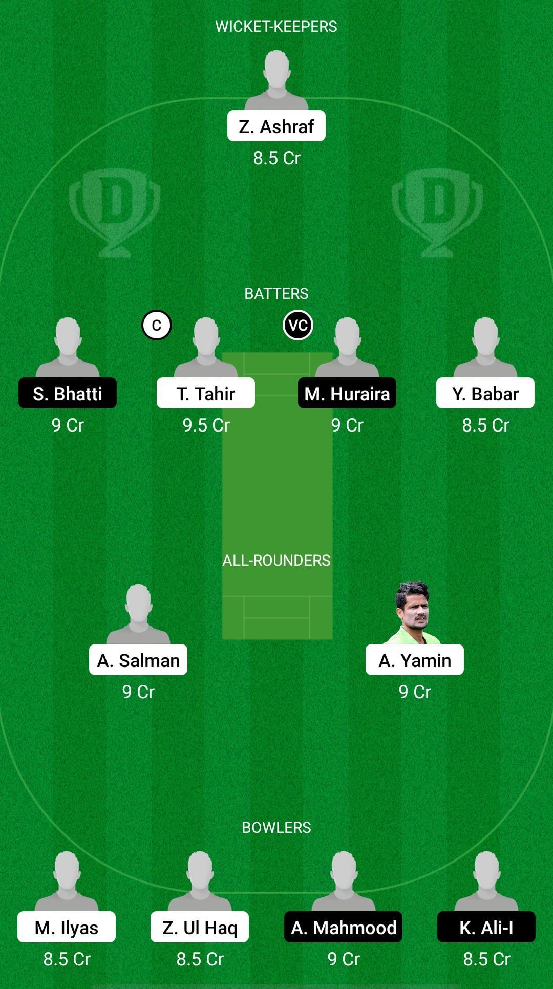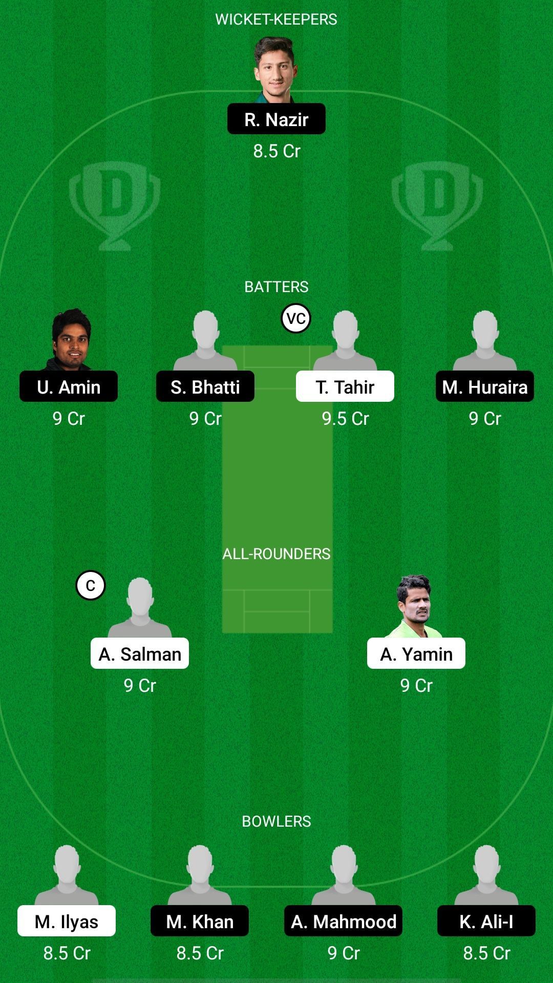 Fantasy Suggestion #1: Rohail Nazir, Umar Amin, Sarmad Bhatti, Tayyab Tahir, Mohammad Huraira, Agha Salman, Aamer Yamin, Mohammad Ilyas, Mubashir Khan, Athar Mahmood, Kashif Ali.