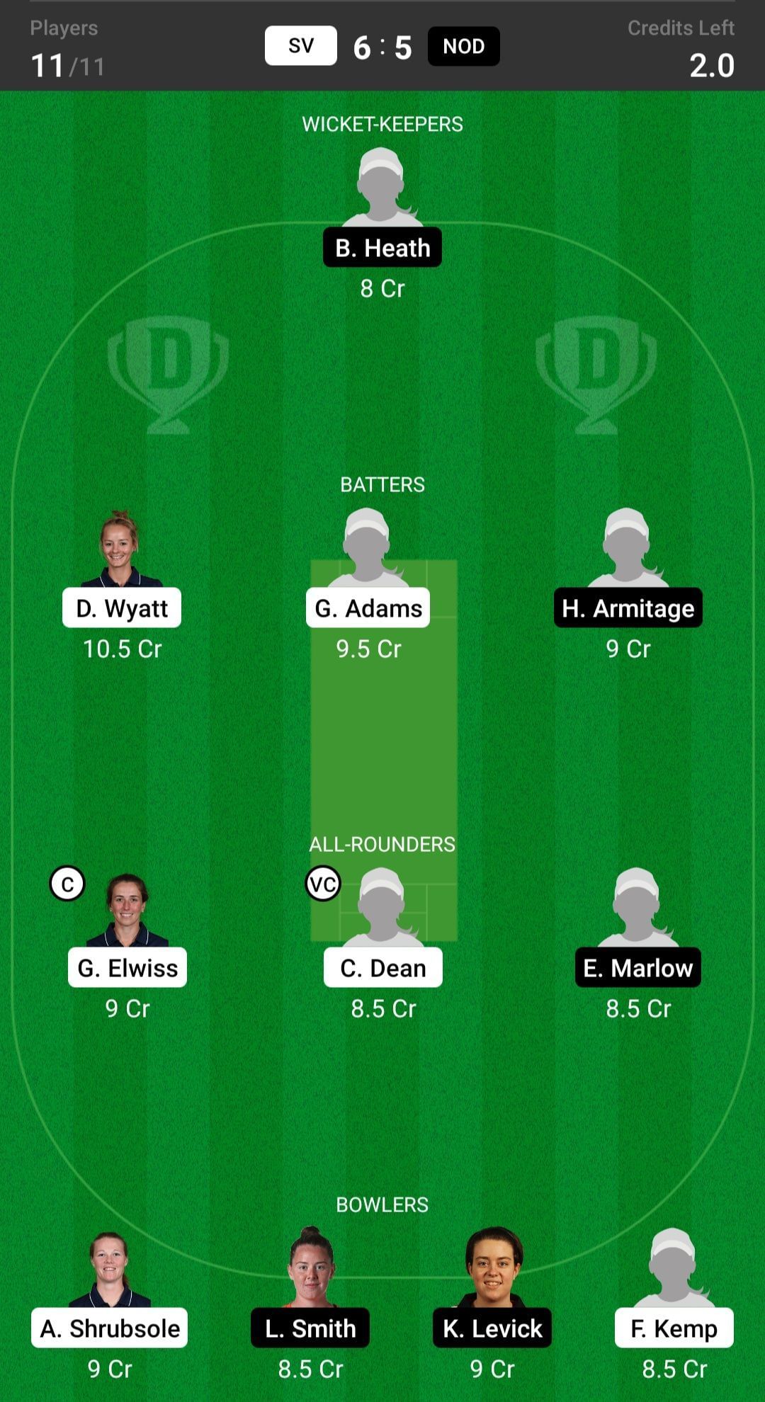Fantasy suggestion #1: B Heath, G Adams, H Armitage, D Wyatt, G Elwiss, E Marlow, C Dean, F Kemp, A Shrubsole, L Smith, and K Levick