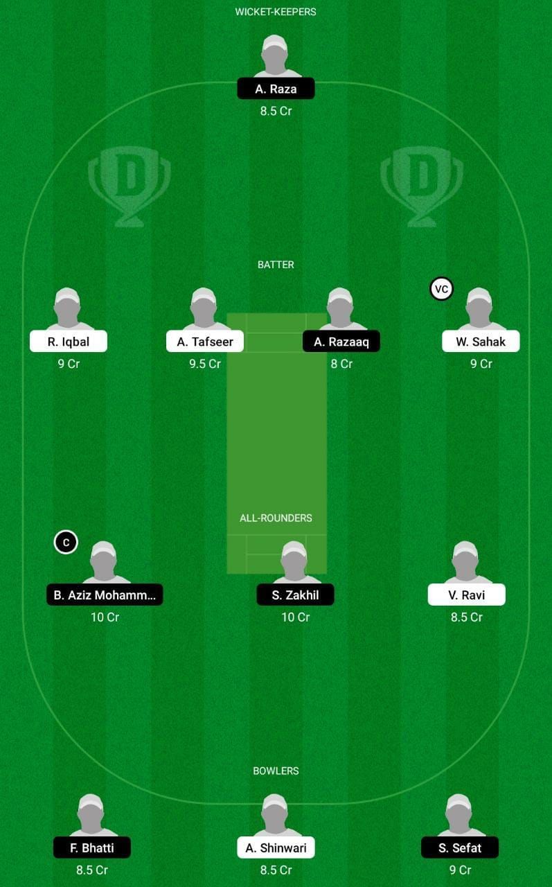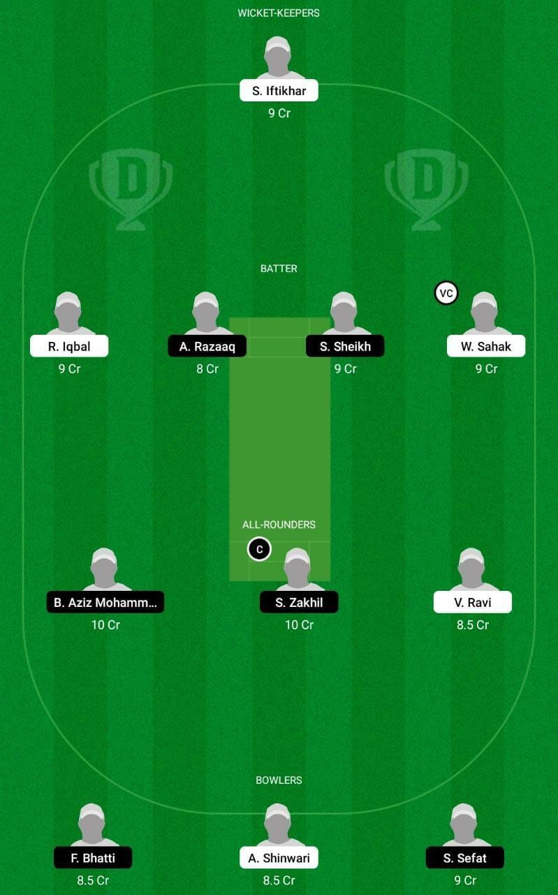 Fantasy Suggestion #1: S Iftikhar, R Iqbal, A Razzaq, S Sheikh, W Sahak, B Aziz Mohammed, S Zakhil, V Ravi, F Bhatti, A Shinwari and S Sefat