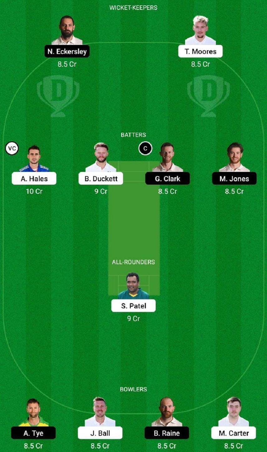 Fantasy Suggestion #2: Ned Eckersley, Tom Moores, Alex Hales, Ben Duckett, Graham Clark, Samit Patel, Michael Jones, Andrew Tye, Jake Ball, Ben Raine and Matt Carter.