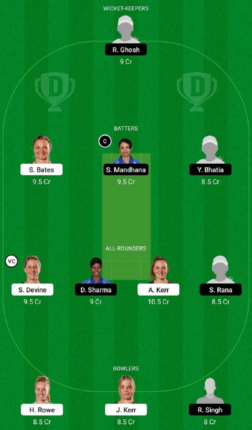 Fantasy Suggestion #1: Richa Ghosh, Suzie Bates, Smriti Mandhana, Yastika Bhatia, Sophie Devine, Deepti Sharma, Amelia Kerr, Sneh Rana, Hannah Rowe, Jess Kerr and Renuka Singh