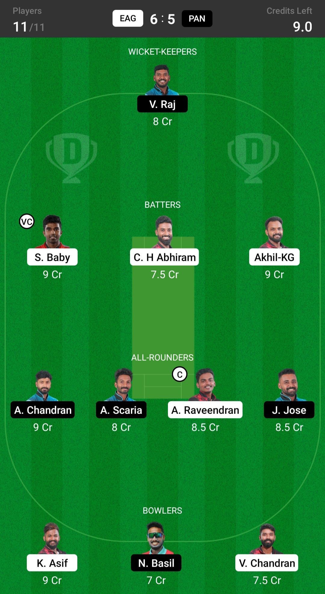 Baby and V Govind are the two best batter picks. Akhil KG is another good pick. He has performed exceptionally well in the last few games.