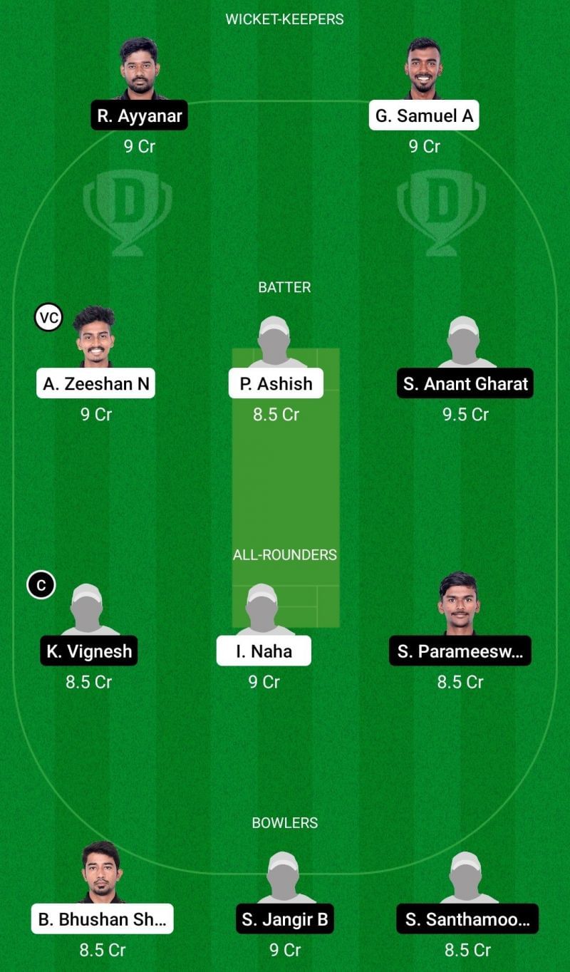Fantasy Suggestion #1: R Ayyanar, Ameer Zeeshan N, Nitish Manik Salekar, Shreeraj Anant Gharat, Kannan Vignesh, Iqlas Naha, Damodaran Rohit, S Parameeswaran, Bharat Bhushan Sharma, Satish Jangir B, Abin Mathew M
