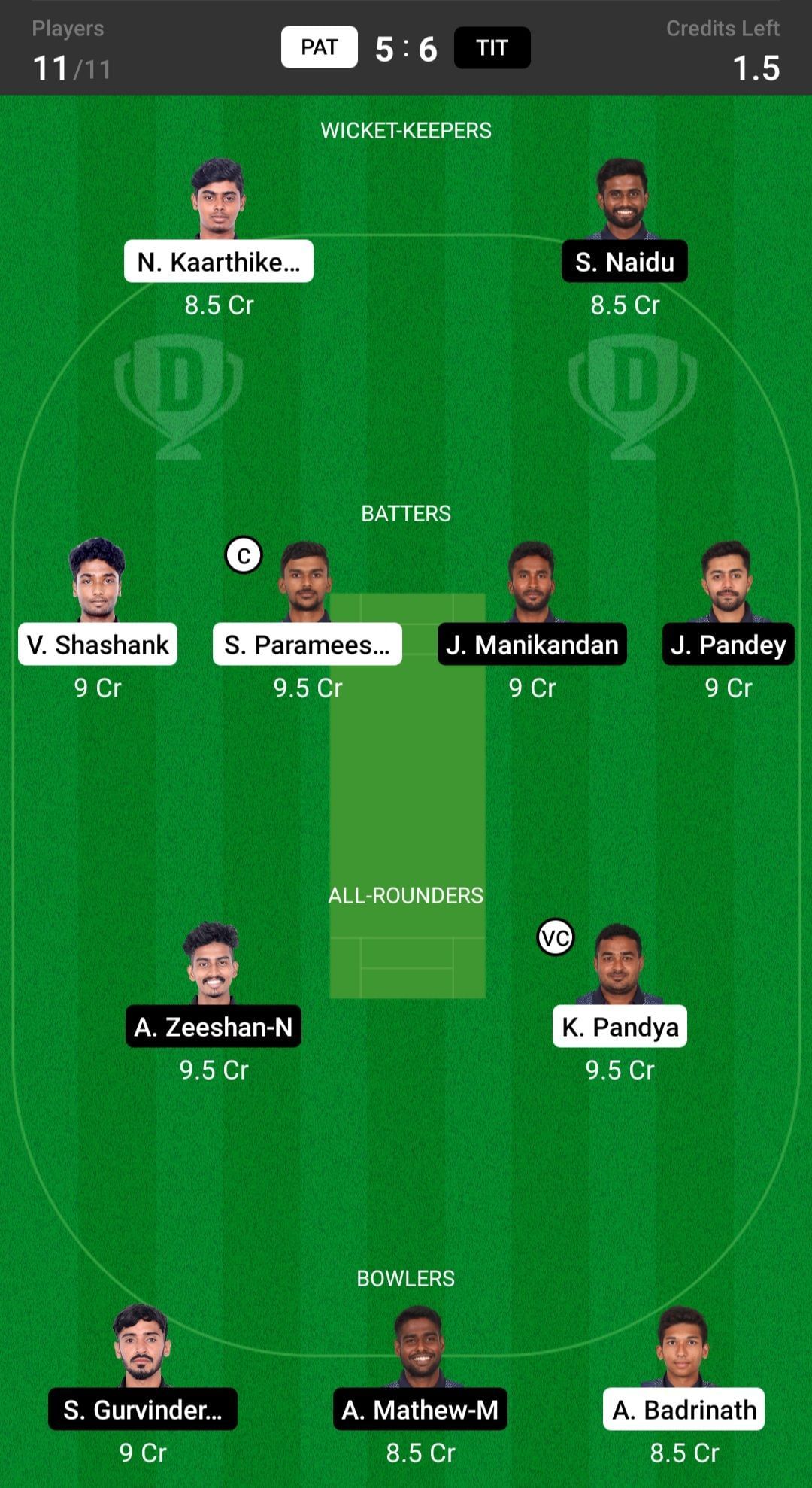 Fantasy suggestion #1: N Kaarthikeyan, S Naidu, V Shashank, S Parameshwaran, J Manikandan, J Pandey, A Zeeshan, K Pandya, Gurvinder Singh, A Matthew, and A Badrinath