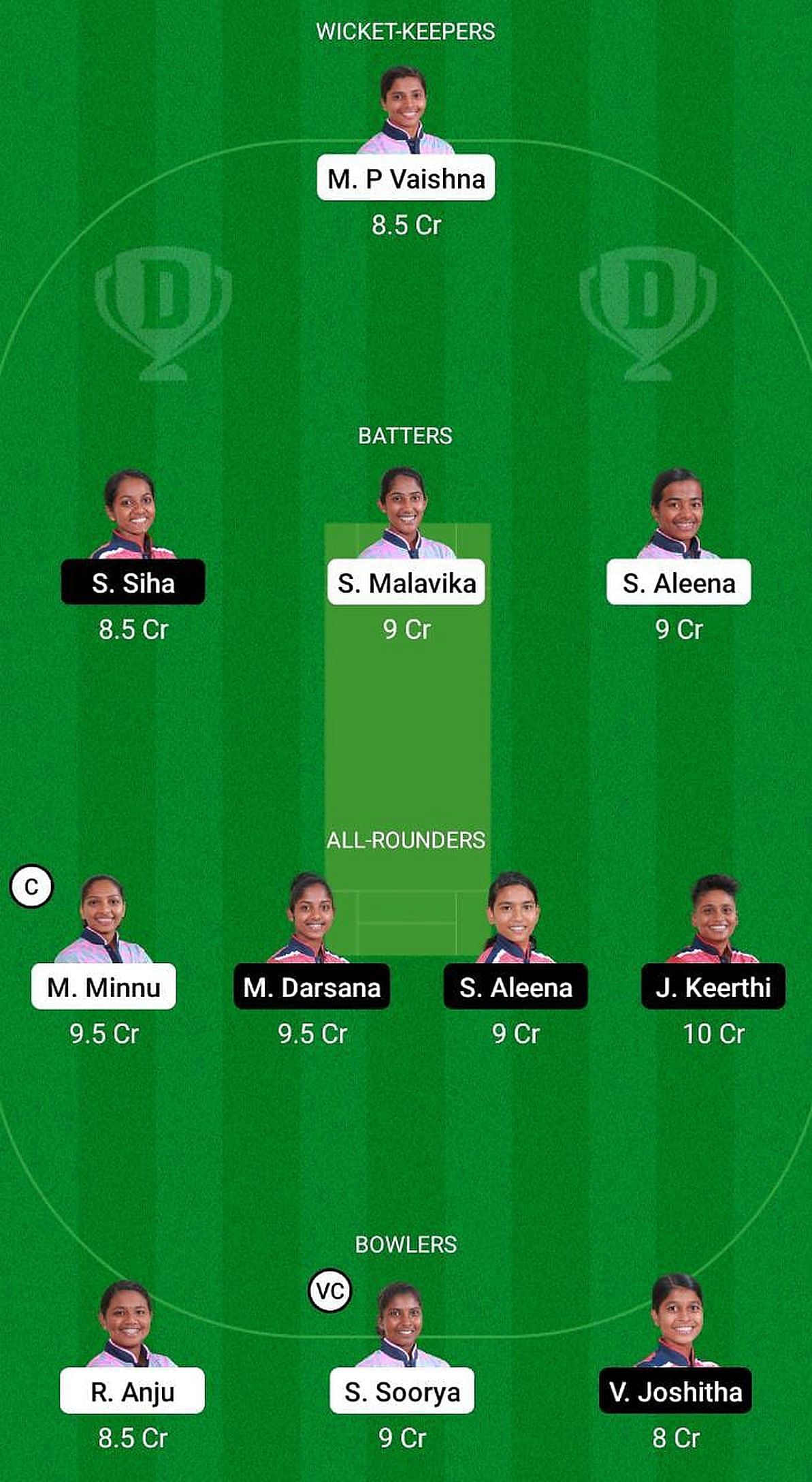 Minnu Mani (c), Malavika Sabu, Vaishna M P (wk), Aleena MP, Soorya Sukumar, Vinaya Surendran, Aiswarya M, Aleena Shibu, Sneha K R, Anju Rajan, Alka A Suresh