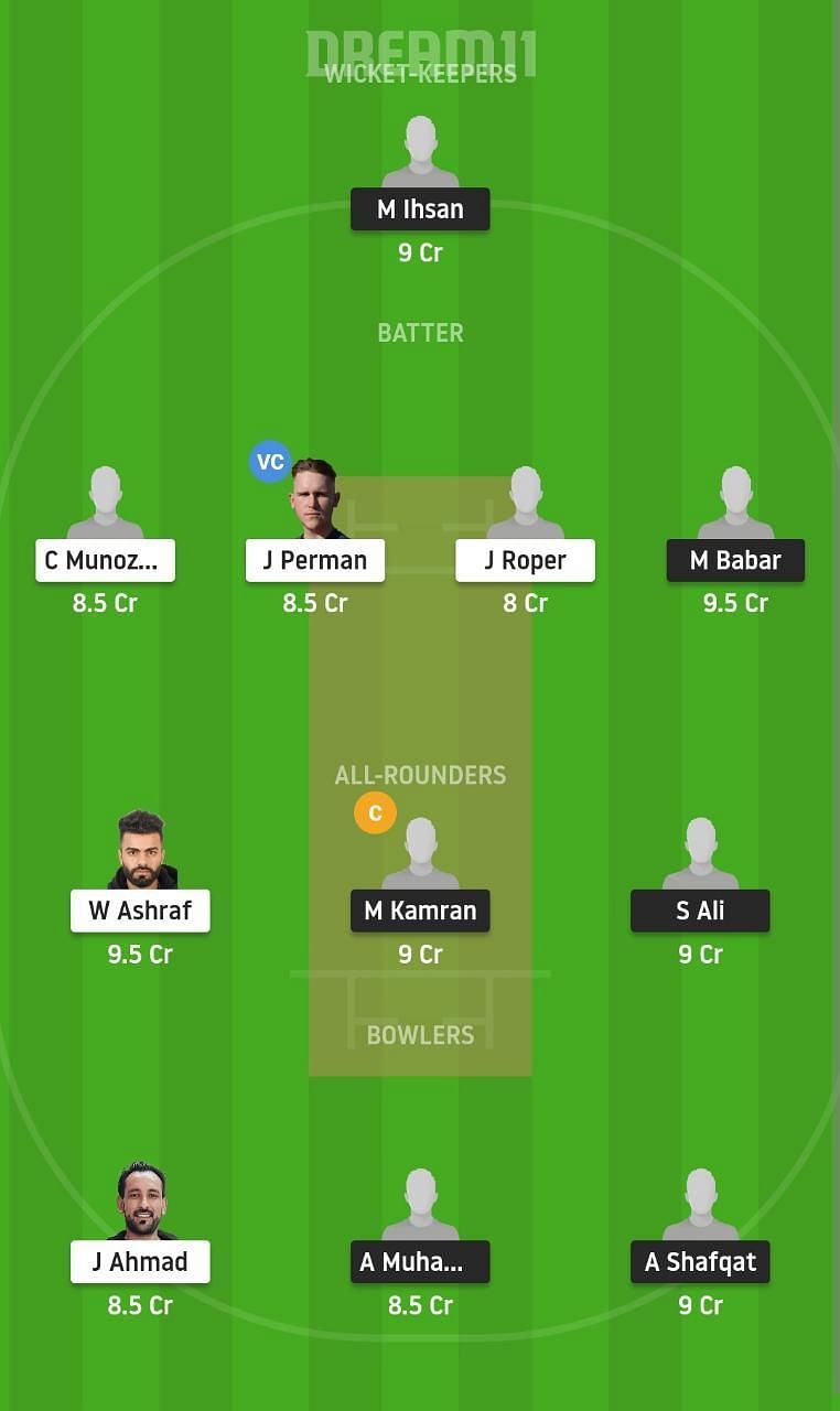 Fantasy Suggestion #1: M Ihsan, J Perman, C Munoz-Mills, M Babar, J Roper, M Kamran, W Ashraf, S Ali, A Shafqat, A Muhammad, J Ahmad.