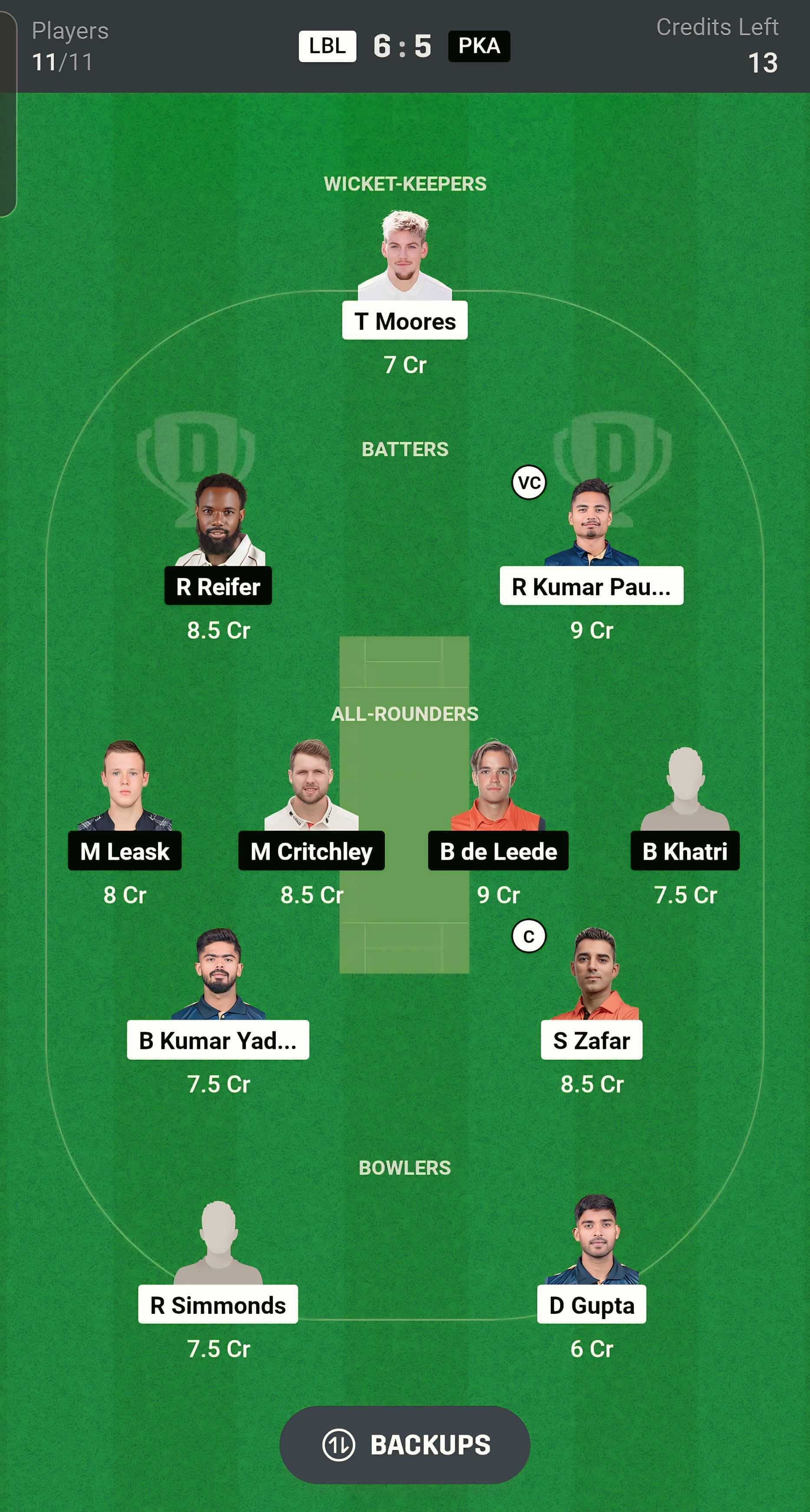 Saad Zafar and Bas de Leede are the best all-rounder picks for the Dream11 team. Both players are crucial for today's match. Saad Zafar will bat in the top order and complete his quota of overs in today's match. He smashed 15 runs and took 2 wickets in the last match. Bipin Khatri is another good all-rounder for today's nail-biting match.