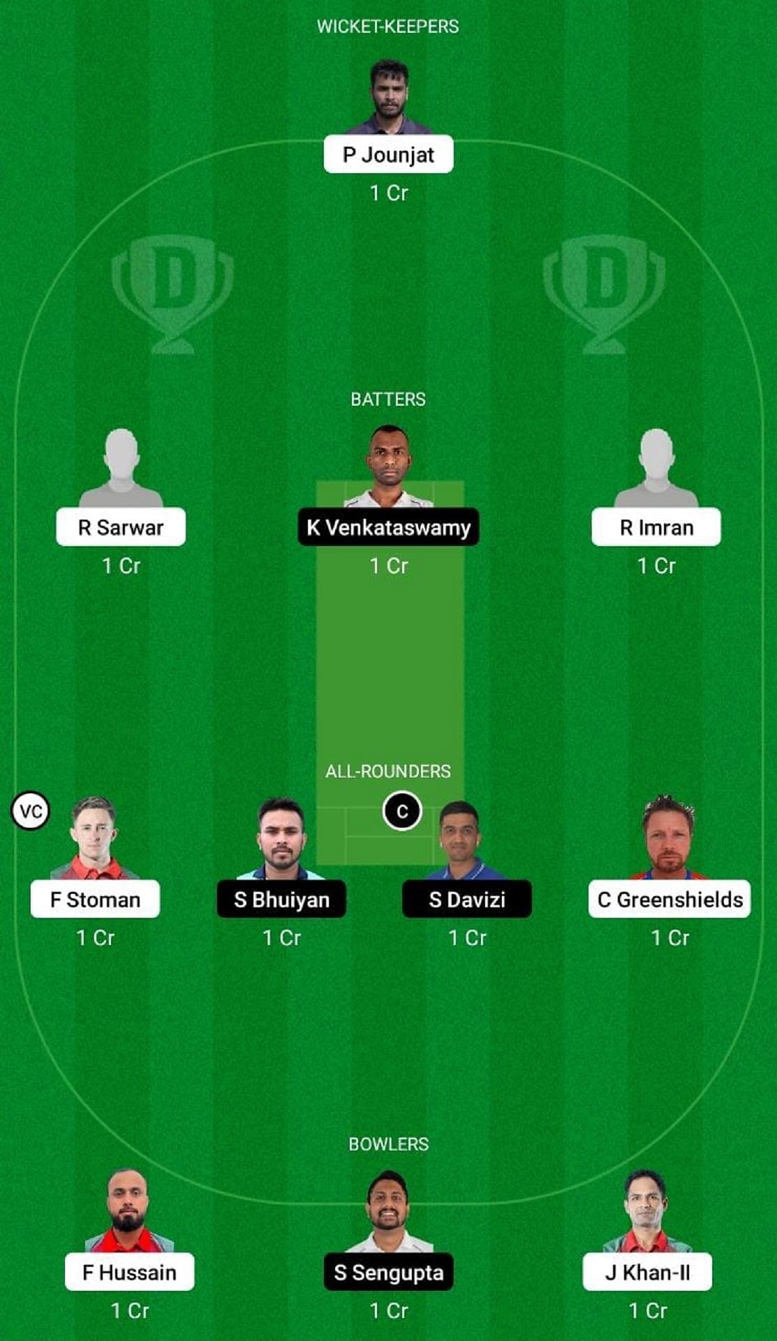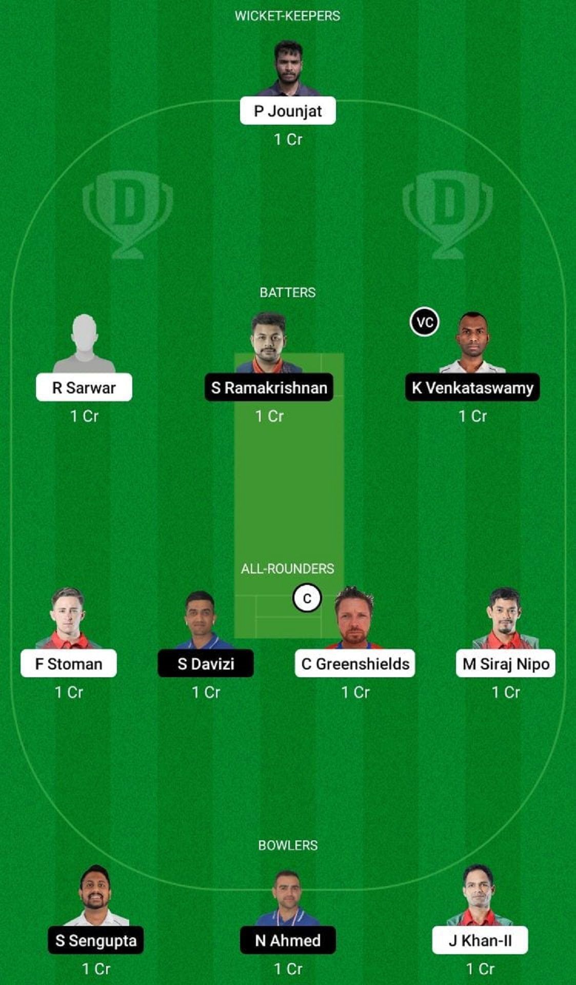 Sharan, Kranthi Venkataswamy, Aakash Parmar, Dylan Steyn, Sabawoon Davizi, Kushalkumar Mendon, Smit Patel-I, Ritik Tomar, Sahil Grover, Divyendra Singh (C), and Abul Farhad.