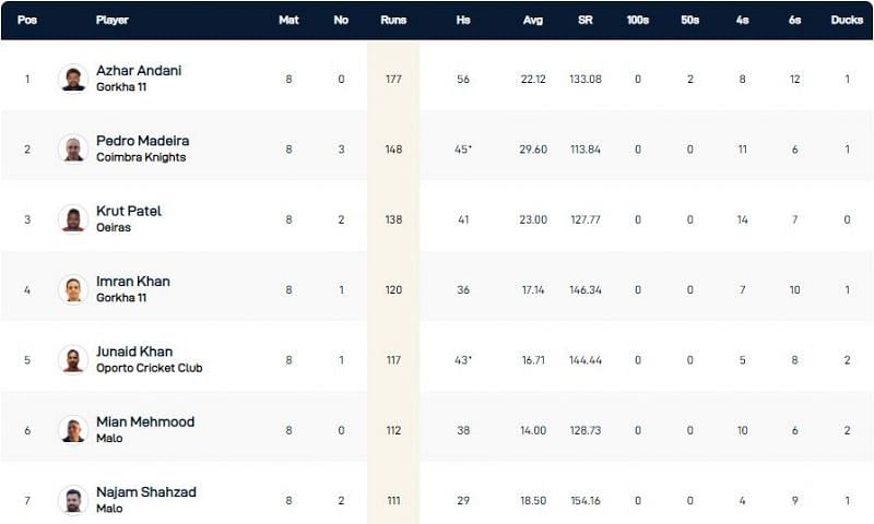 Pedro Madeira of the Coimbra Knights has jumped to second spot on the run-scoring charts. He has accumulated 148 runs to date, with an unbeaten 45 being his top score. Madeira's runs have come at a strike rate of 113.84, and include 11 fours and six maximums.