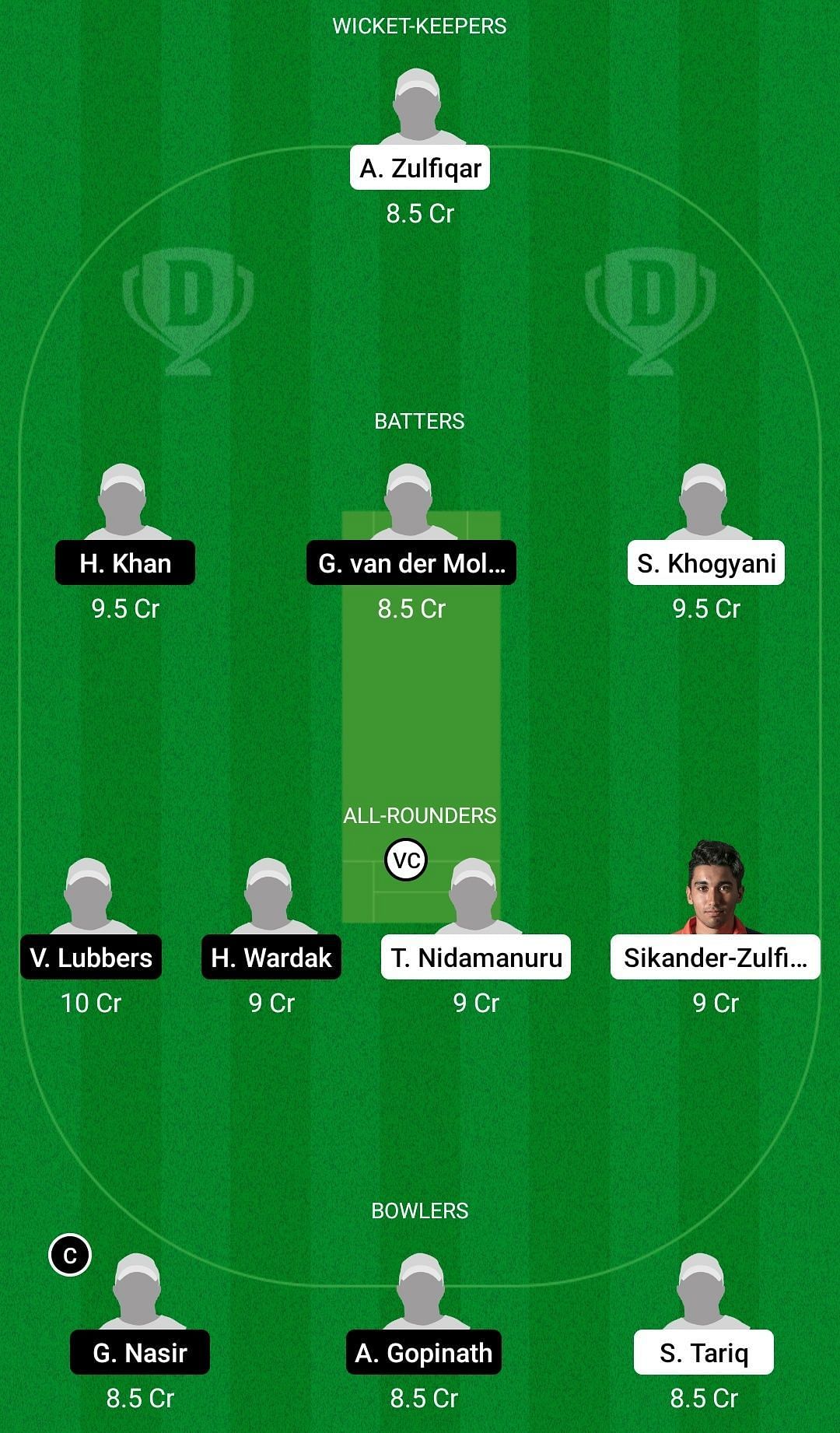 Fantasy Suggestion #1: Asad Zulfiqar, Hashim Khan, Gijs van der Molen, Sharafat Khogyani, Victor Lubbers, Hamid Wardak, Teja Nidamanuru, Sikander Zulfiqar, Gul Nasir, Akhil Gopinath, Mubashar Hussain.