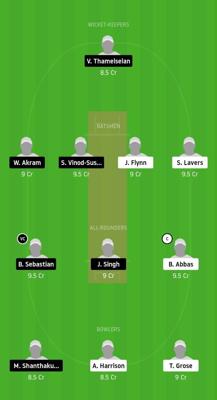 Fantasy Suggestion #1: V Thamelselan, W Akram, S Vinod-Suseela, J Flynn, S Lavers, B Sebastian, J Singh, B Abbas, M Shanthakumar, A Harrison, T Grose