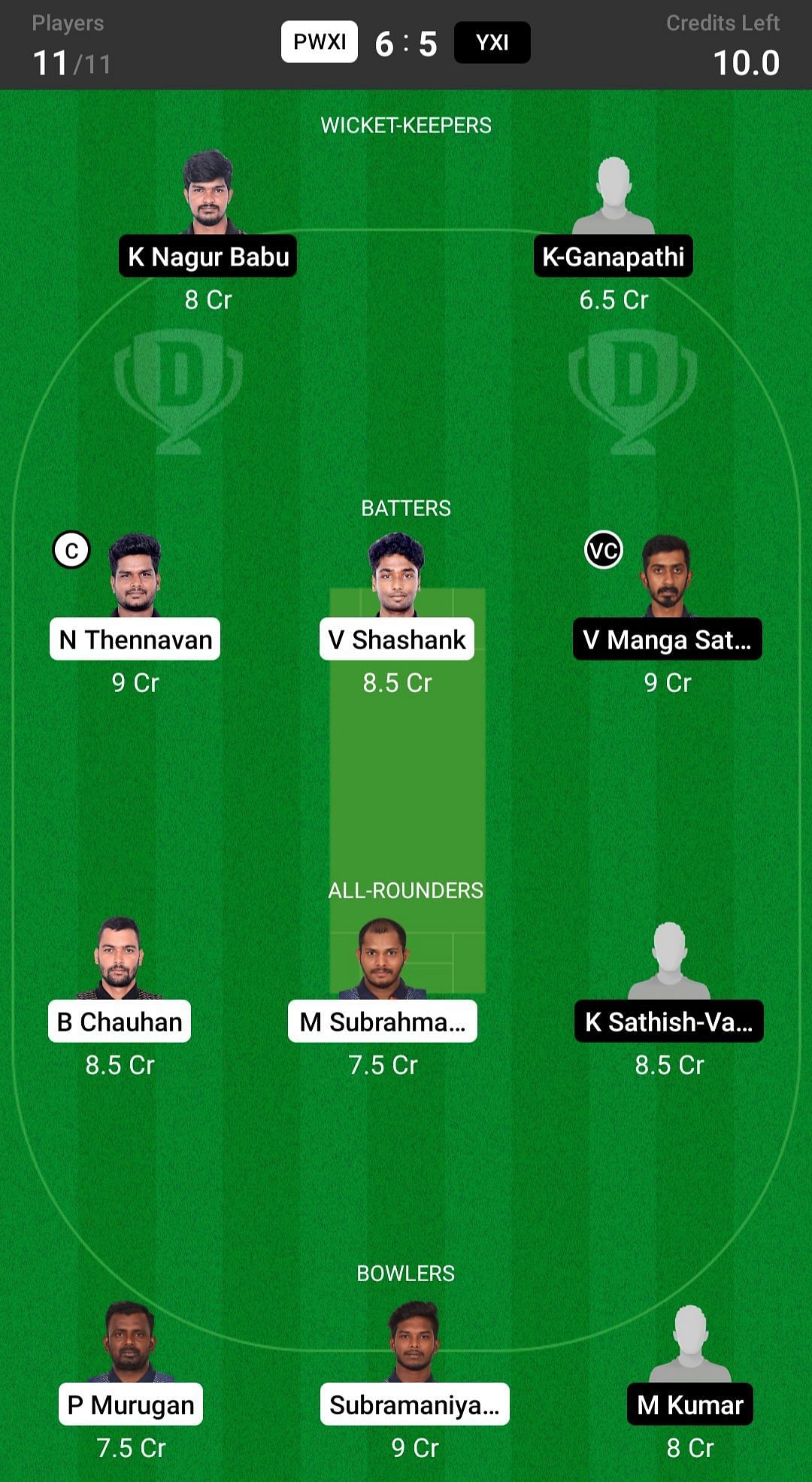 V Shashank and N Thennavan are the two best batter picks for the Dream11 team. V Manga is another good pick for today's Dream11 team. He has performed exceptionally well in the last few matches.