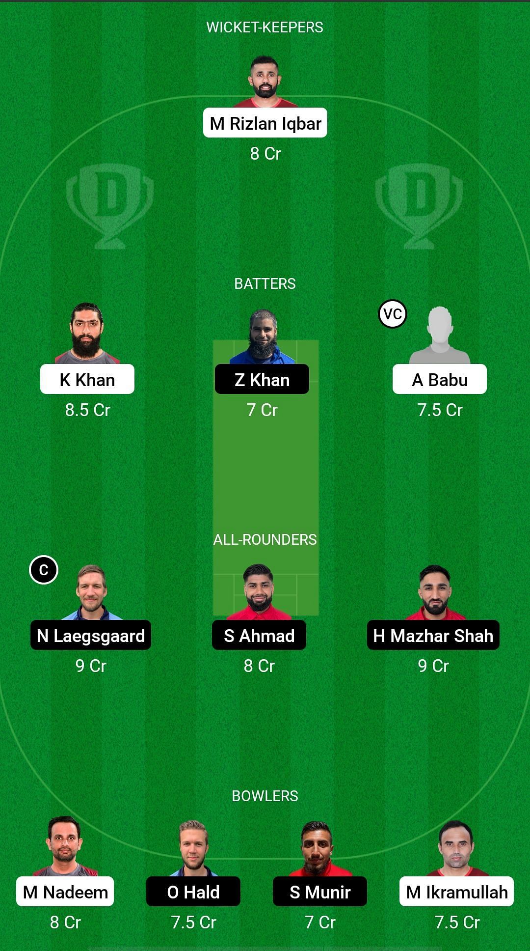 Mohammed Rizlan (c & wk), Kamran Khan, Imal Liyanage, Assad Borham, Muhammad Tanveer, Akash Babu, Muhammad Ikramullah, Dharmang Patel, Mohammed Nadeem, MD Yousuf Ali, Gayan Munaweera.