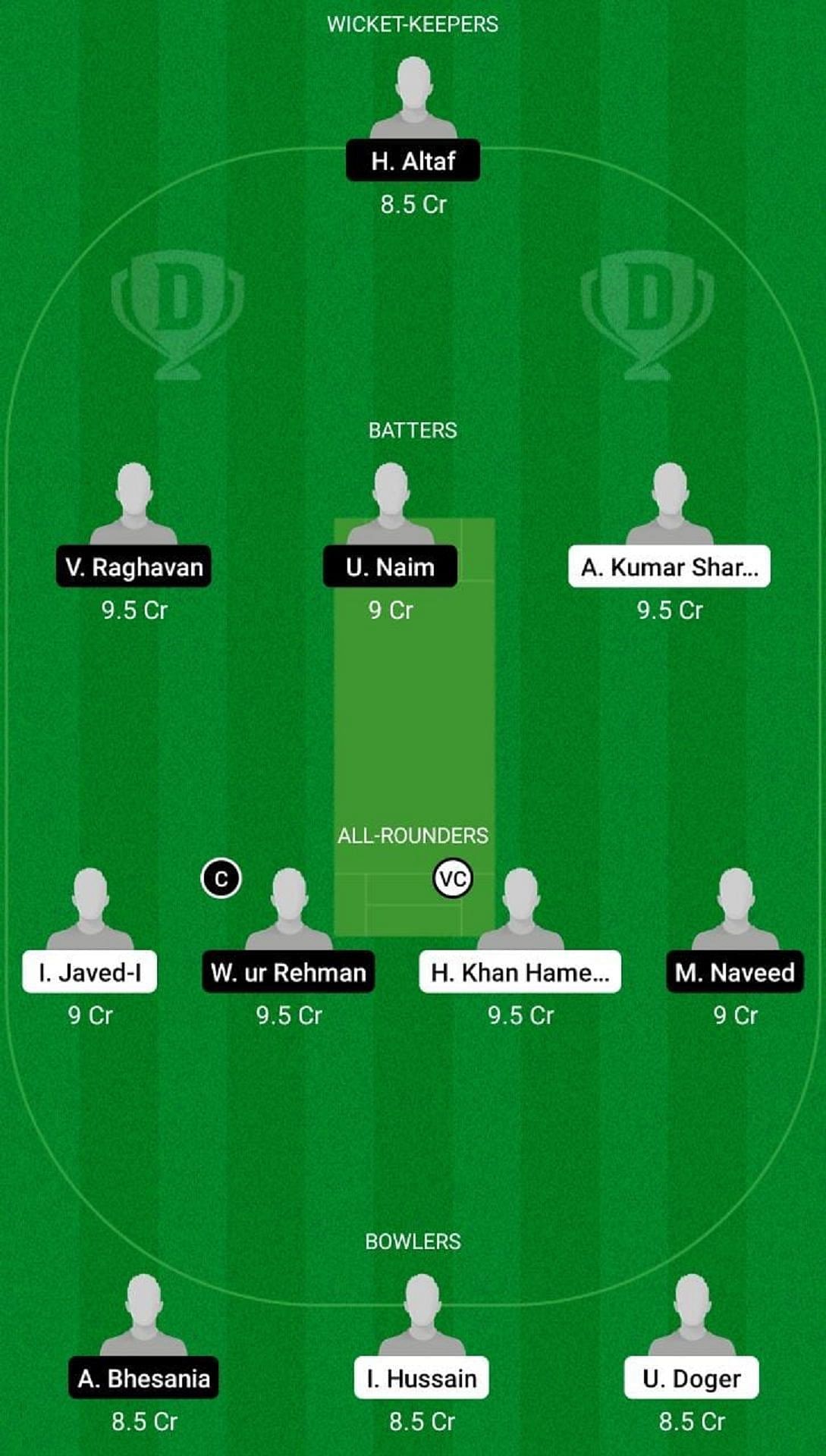 Fantasy Suggestion #2: H Altaf, A Kumar Sharma, V Raghavan, U Naim, W ur Rehman, H Khan Hameedi, I Javed, I Hussain, U Doger, A Bhesania, Z Ahmed