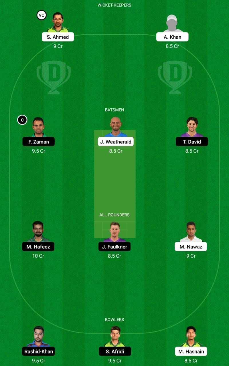 Fantasy Suggestion #1: Sarfaraz Ahmed, Azam Khan, Fakhar Zaman, Tim David, Jake Weatherald, Mohd Hafeez, James Faulkner, Mohd Nawaz, Shaheen Afridi, Rashid Khan and Mohd Hasnain