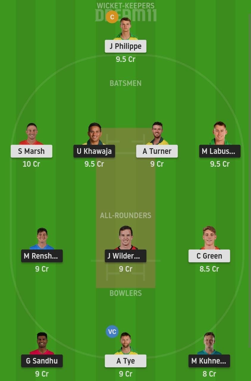 Fantasy Suggestion #1: Josh Phillippe, Ashton Turner, Shaun Marsh, Marnus Labuschagne, Usman Khawaja, Matthew Renshaw, Jack Wildermuth, Cameron Green, Andrew Tye, Gurinder Sandhu, Matthew Kuhnemann.