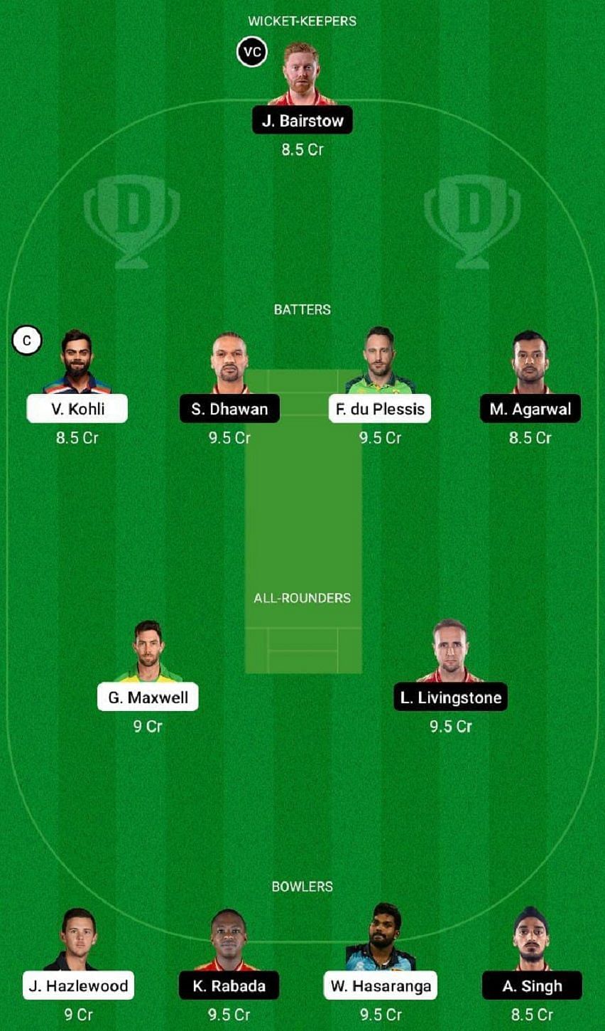 Fantasy Suggestion #1: Jonny Bairstow, Virat Kohli, Shikhar Dhawan, Faf du Plessis, Mayank Agarwal, Glenn Maxwell, Liam Livingstone, Josh Hazlewood, Kagiso Rabada, Wanindu Hasaranga and Arshdeep Singh.