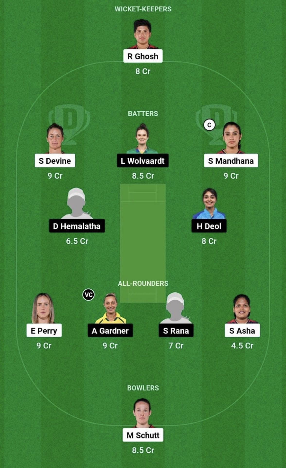 Batters: Sophie Devine, Laura Wolvaardt, Smriti Mandhana (c), Dayalan Hemalatha, Harleen Deol
