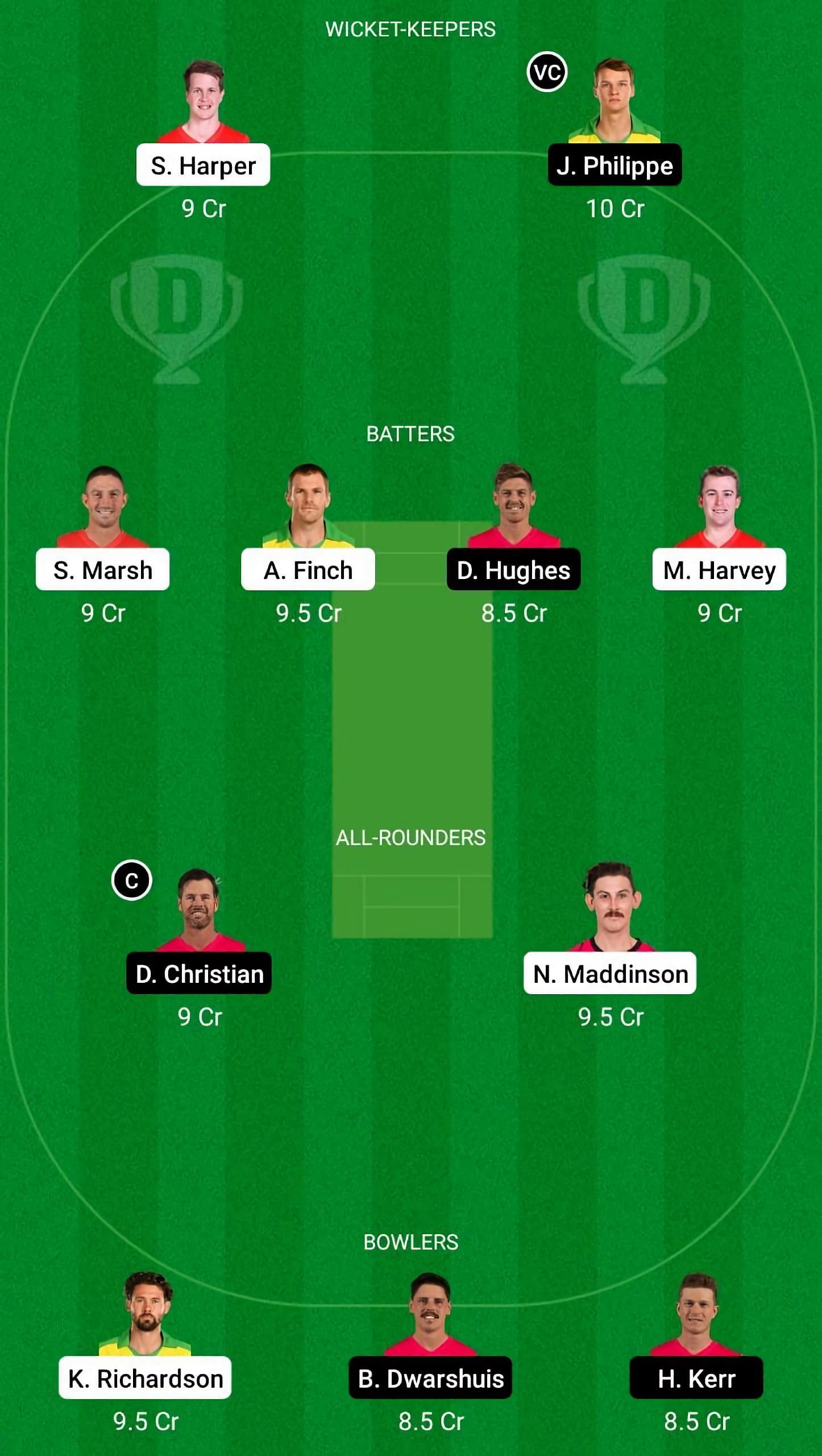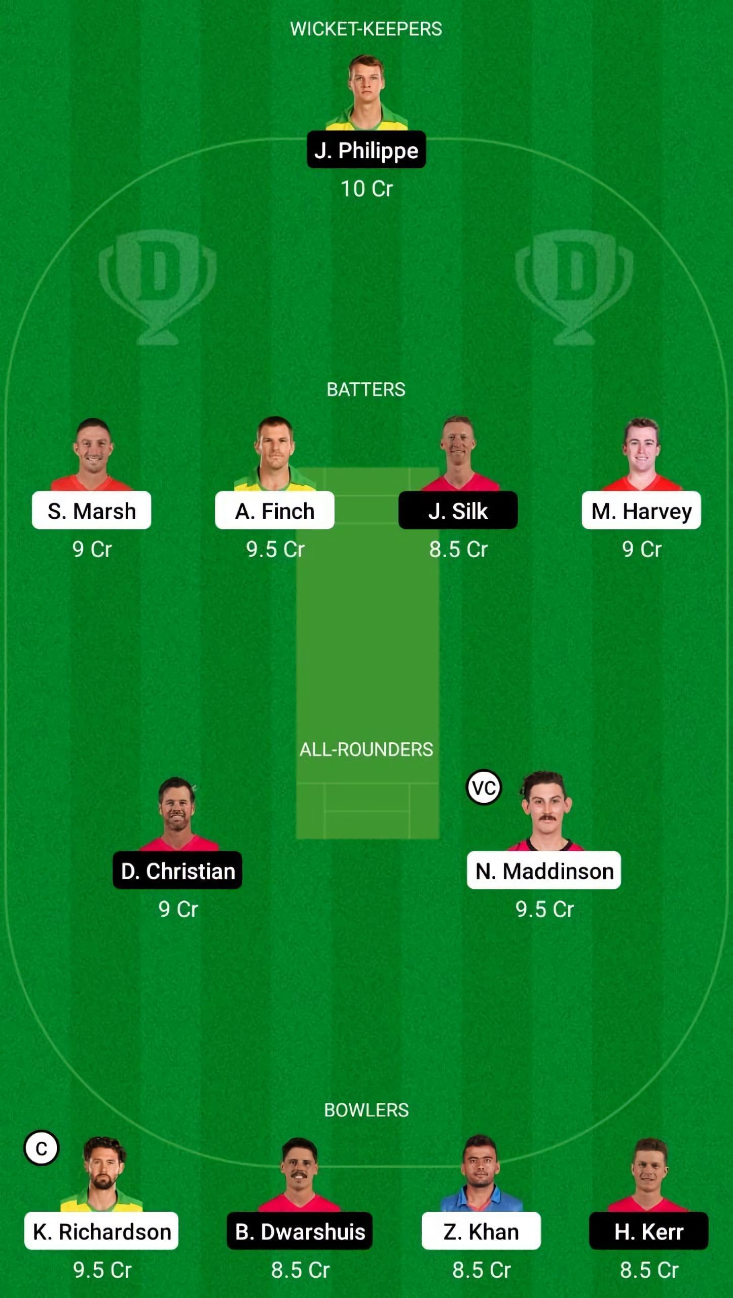 Fantasy Suggestion #1: Josh Philippe, Sam Harper, Mackenzie Harvey, Aaron Finch, Daniel Hughes, Shaun Marsh, Dan Christian, Nic Maddinson, Kane Richardson, Hayden Kerr, Ben Dwarshuis