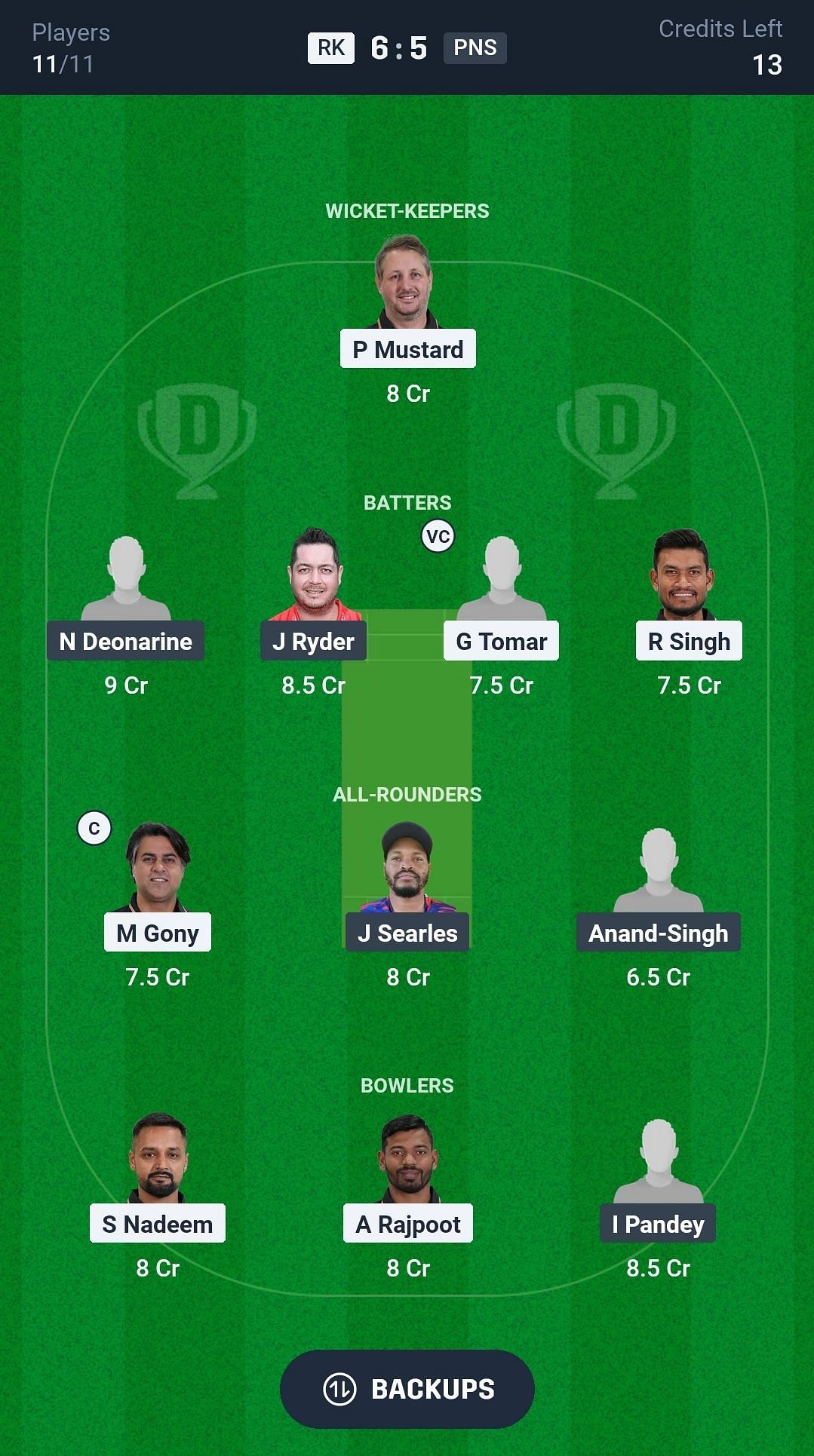 Batters: J Ryder, G Tomar, R Singh, N Deonarine