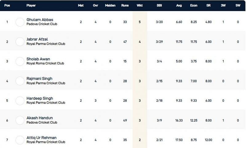 Ghulam Abbas of Padova Cricket Club has emerged as the highest wicket-taker on Day 1 of the Rome T10 League 2020. He has taken 5 wickets in the two matches he has played. Abbas has a best bowling effort of 3/20 and has a decent economy rate of 8.25.