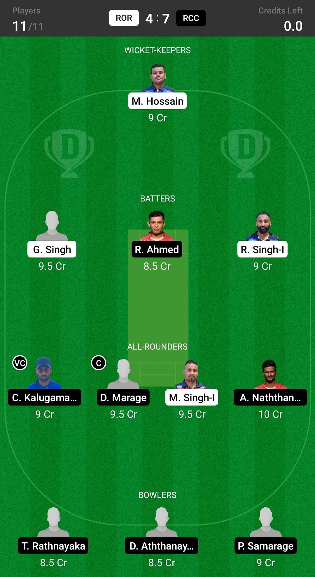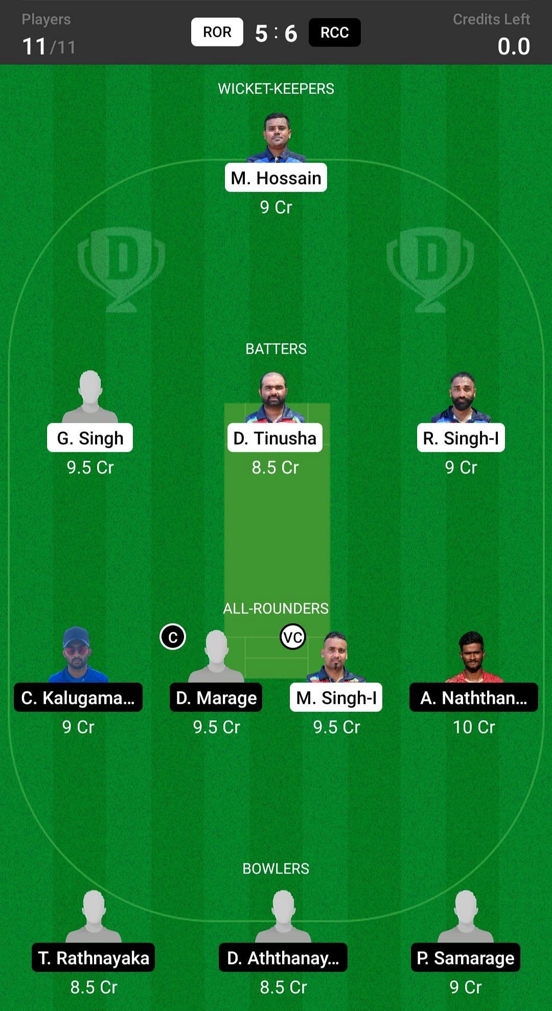 Fantasy suggestion #1: M Hossain, R Ahmed, G Singh, R Singh, A Naththandige, D Marage, C Kalugamage, M Singh, D Aththanayaka, T Rathnayaka, P Samarage
