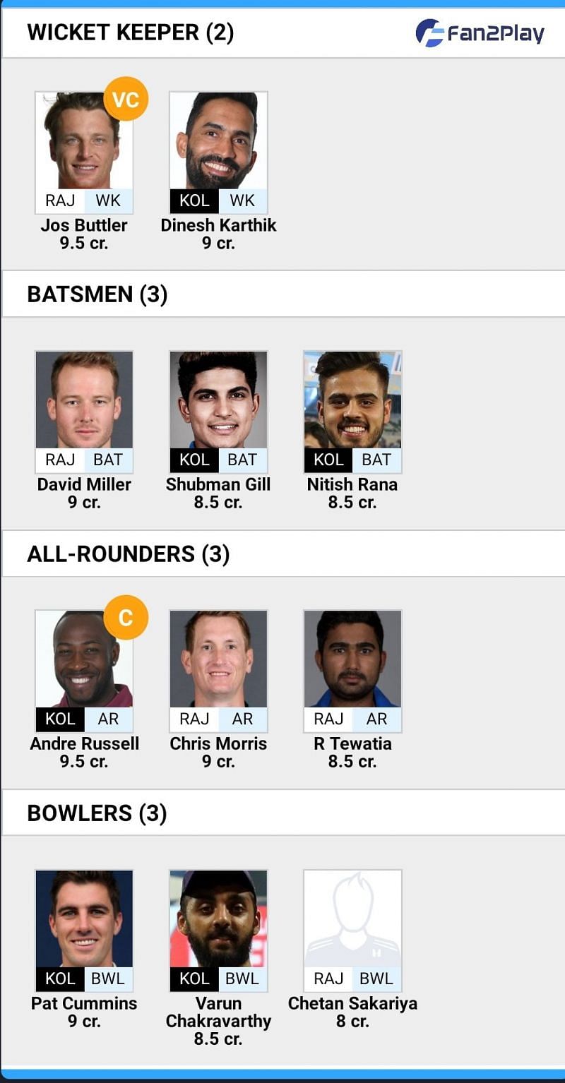 Jos Buttler, Dinesh Karthik, David Miller, Shubman Gill, Nitish Rana, Andre Russell, Chris Morris, Rahul Tewatia, Pat Cummins, Varun Chakravarthy, Chetan Sakariya.