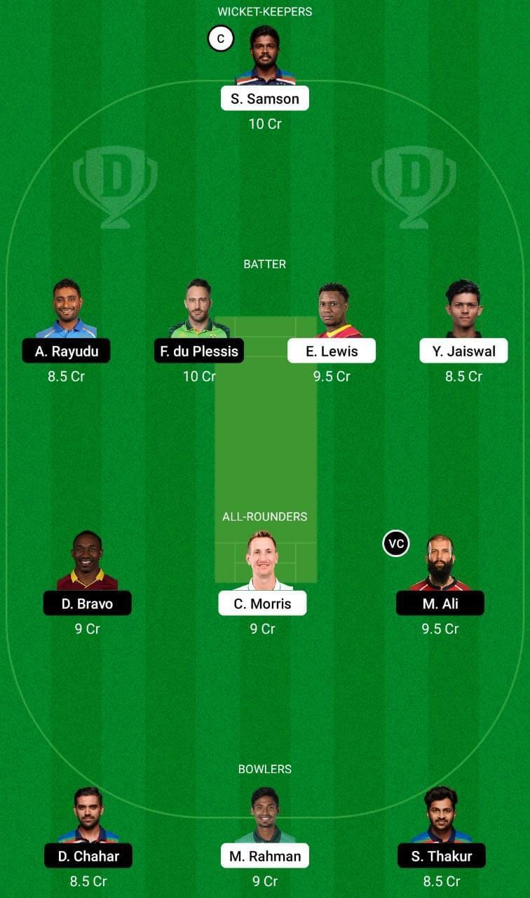 Fantasy Suggestion #1: Sanju Samson, Ambati Rayudu, Faf du Plessis, Evin Lewis, Yashasvi Jaiswal, Dwayne Bravo, Chris Morris, Moeen Ali, Mustafizur Rahman, Shardul Thakur and Deepak Chahar