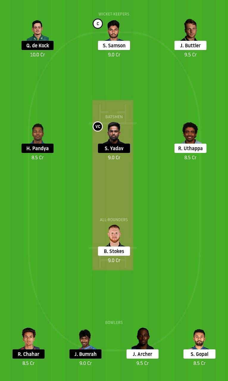 Fantasy Suggestion #1: Quinton de Kock, Sanju Samson, Jos Buttler, Suryakumar Yadav, Hardik Pandya, Robin Uthappa, Ben Stokes, Jasprit Bumrah, Jofra Archer, Rahul Chahar and Shreyas Gopal