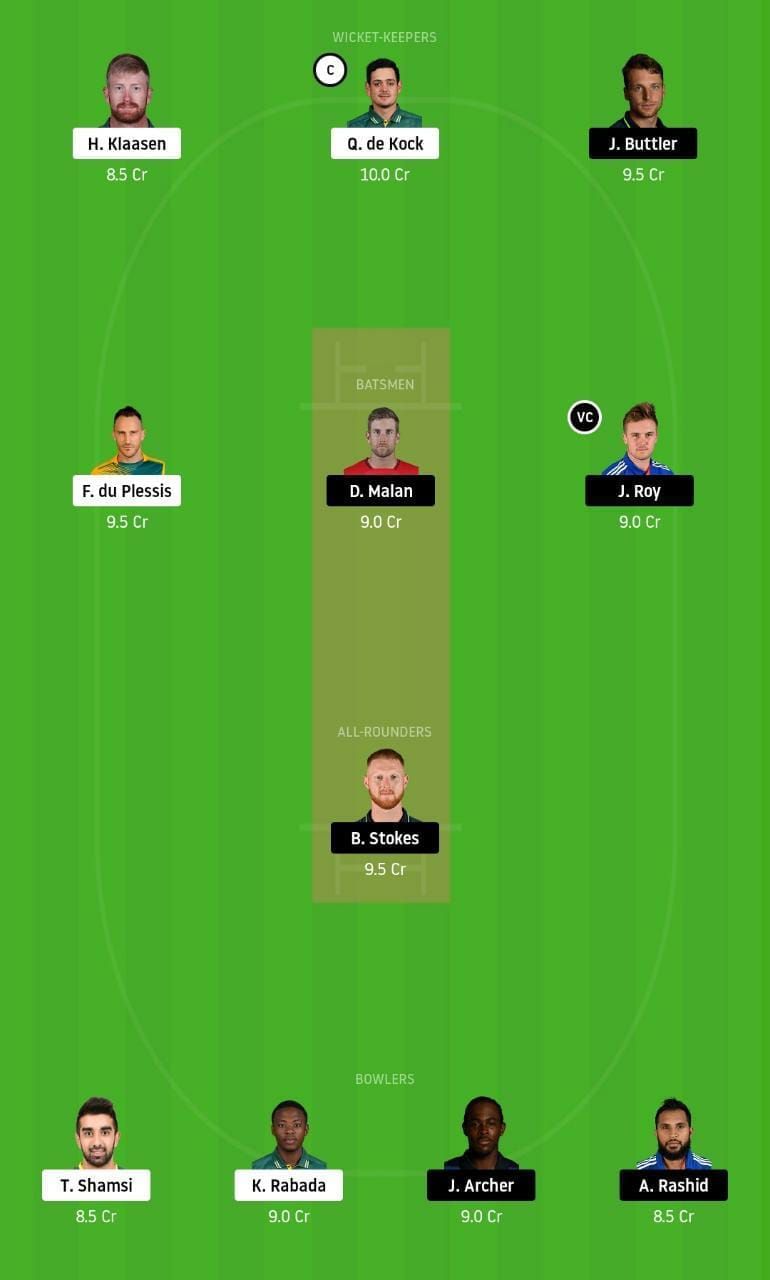 Fantasy Suggestion #1: Quinton de Kock, Faf du Plessis, Heinrich Klaasen, Dawid Malan, Jason Roy, Ben Stokes, Jos Buttler, Kagiso Rabada, Tabraiz Shamsi, Adil Rashid, and Jofra Archer