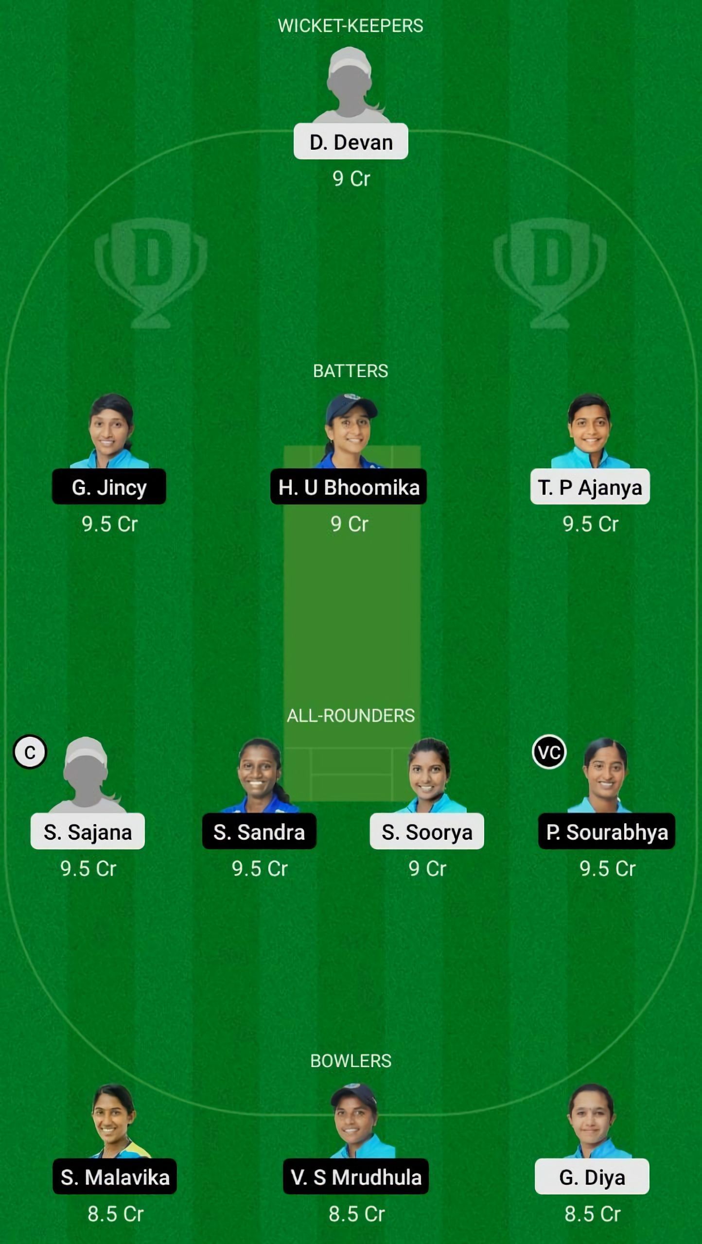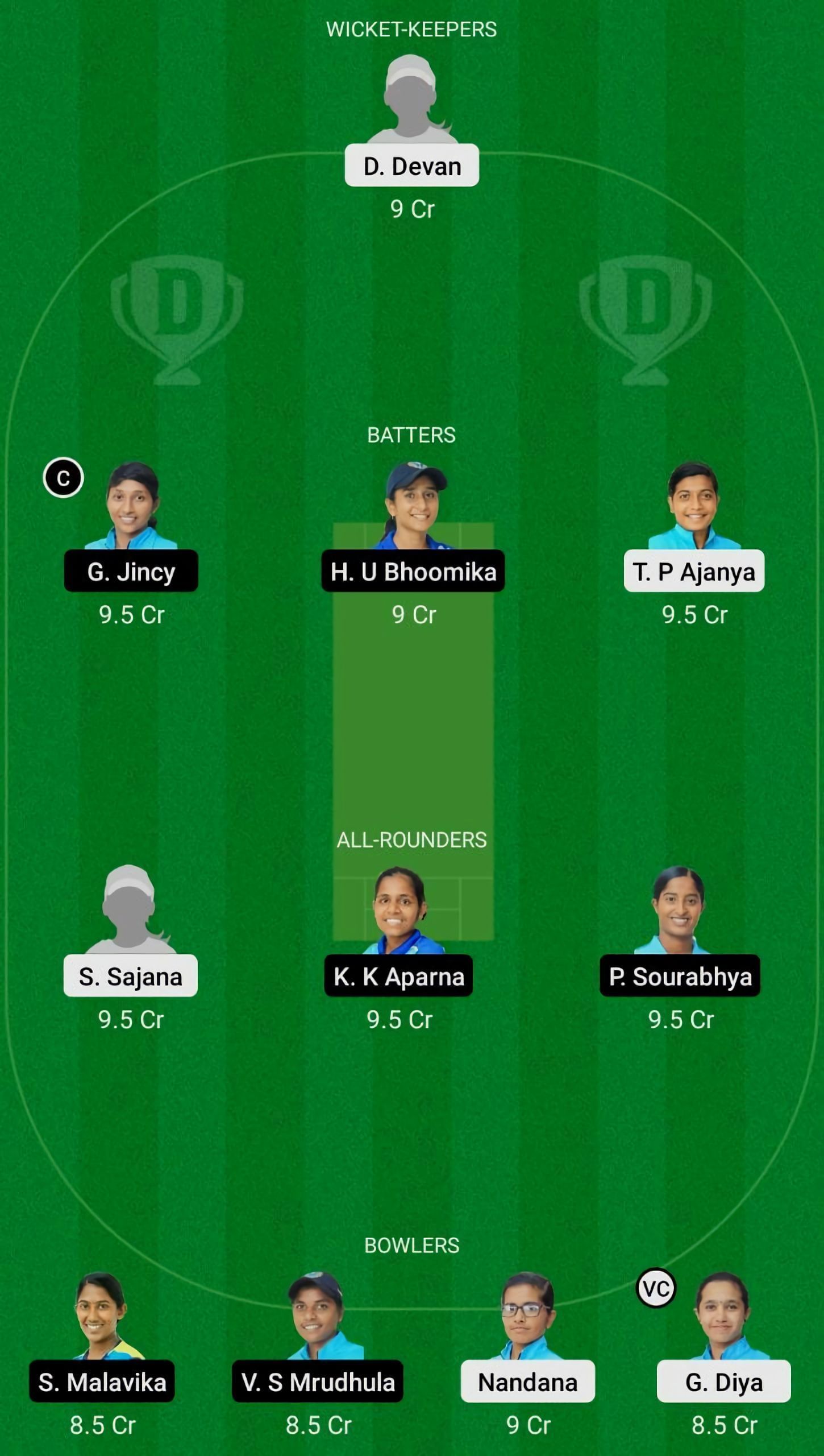 Fantasy Suggestion #1: D Devan, G Jincy, T P Ajanya, H U Bhoomika, S Sajana, P Sourabhya, S Sandra, S Soorya, G Diya, V S Mrudhula, S Malavika