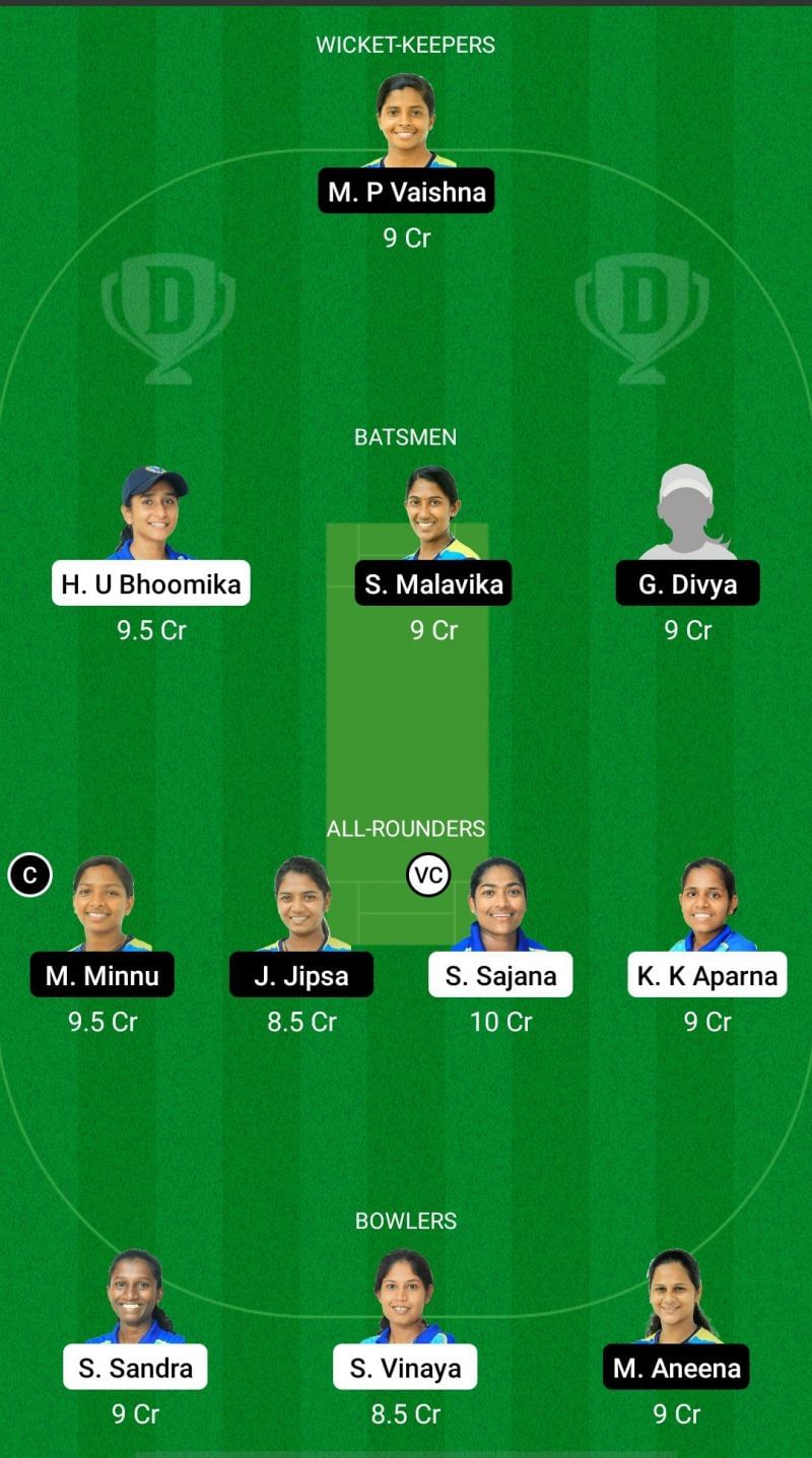 Fantasy Suggestion #2: Vaishna MP, H U Bhoomika, Siha Santosh, Divya Ganesh, Minnu Mani, S Sajana, Alka A Suresh, Sandra Suren, Vinaya Surendran, Aneena Mathew, Biby Sebastin.