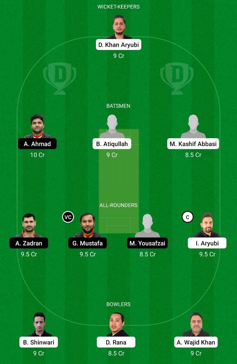 Fantasy Suggestion #1: Dawood Aryubi, Atiqullah Bawar, Kashif Abbasi, Adeel Ahmad, Israfeel Aryubi, Amin Zadran, Gulraiz Mustafa, Matiullah Yousafzai, Bilal Shinwari, Wajid Khan, Dev Rana