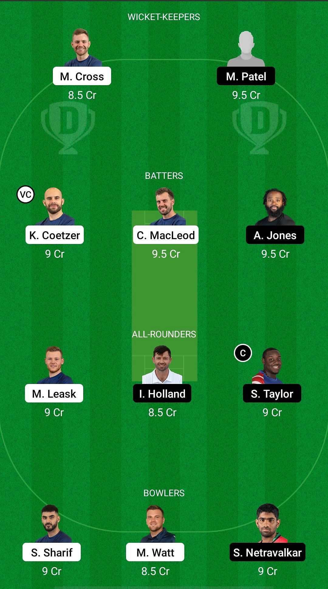 Fantasy Suggestion #1: Matthew Cross, Monank Patel, Kyle Coetzer, Callum MacLeod, Aaron Jones, Michael Leask, Ian Holland, Steven Taylor, Safyaan Sharif, Mark Watt, Saurabh Netravalkar.