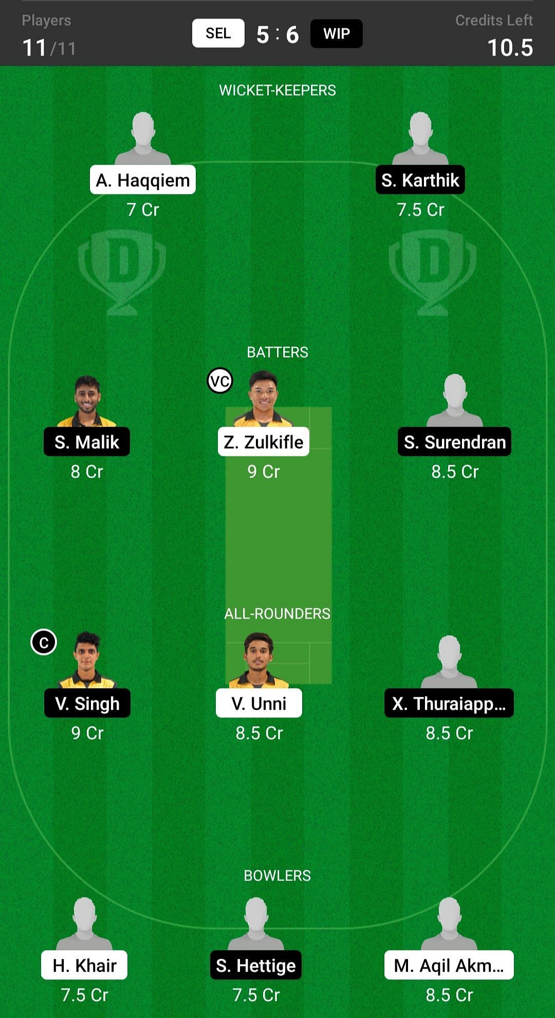 Z Zulkifle and S Surendran are the two best batter picks for the Dream11 team. S Malik is another good pick for today's Dream11 team. He has performed exceptionally well in the last few matches.