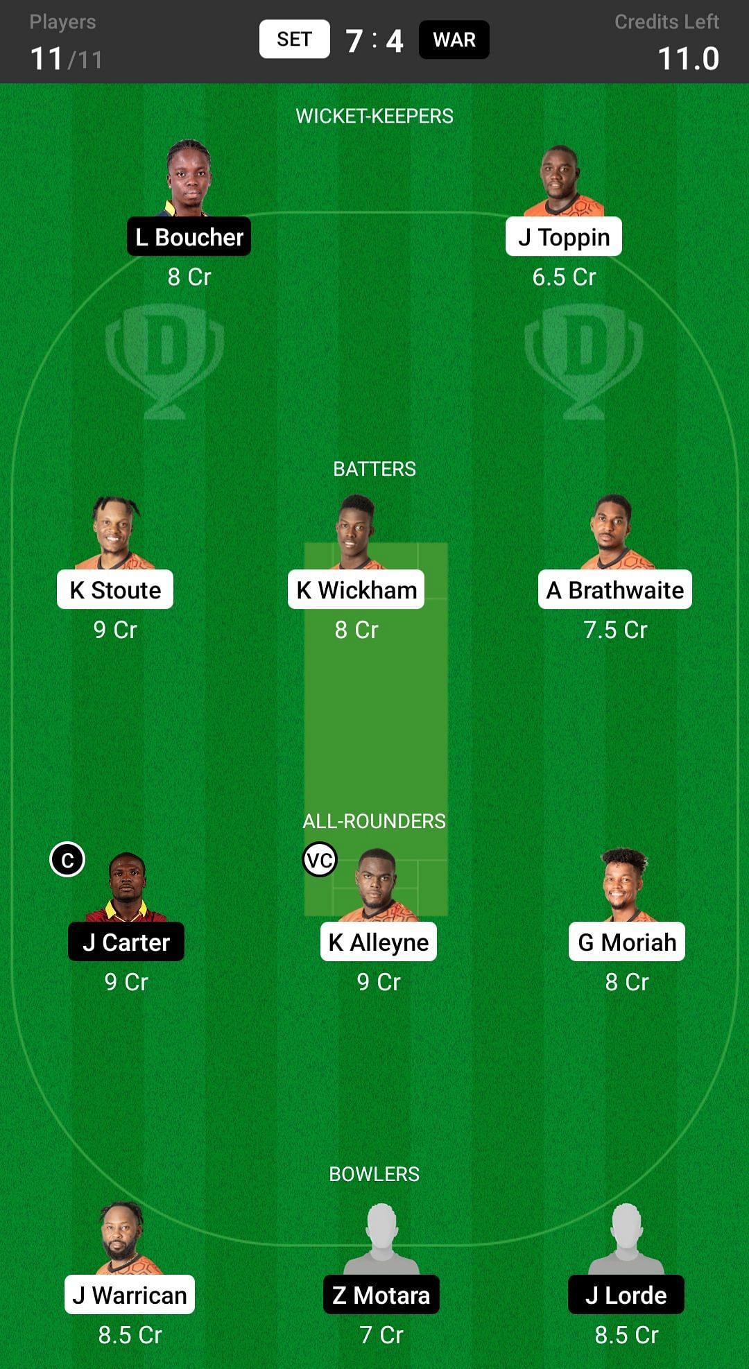 The top bowler picks for today's Dream11 team are J Warrican and J Lorde. Both have bowled brilliantly in the last few matches, and you can also expect them to bowl in death overs. Z Motara is another good pick for the Dream11 team.