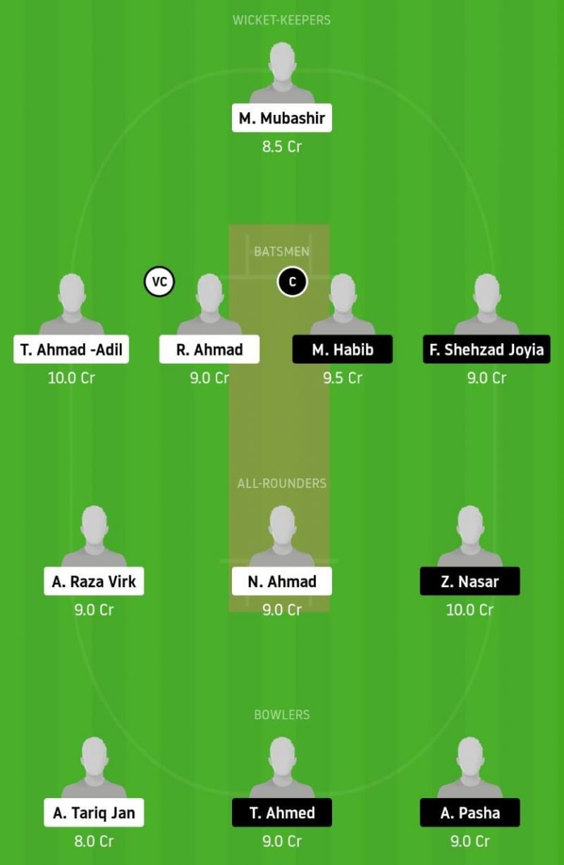 Fantasy Suggestion #1: M Mubashir, T Adil, R Ahmad, M Habib, F Joyia, A Virk, N Ahmad, Z Nasar, A Jan, T Ahmed and A Pasha