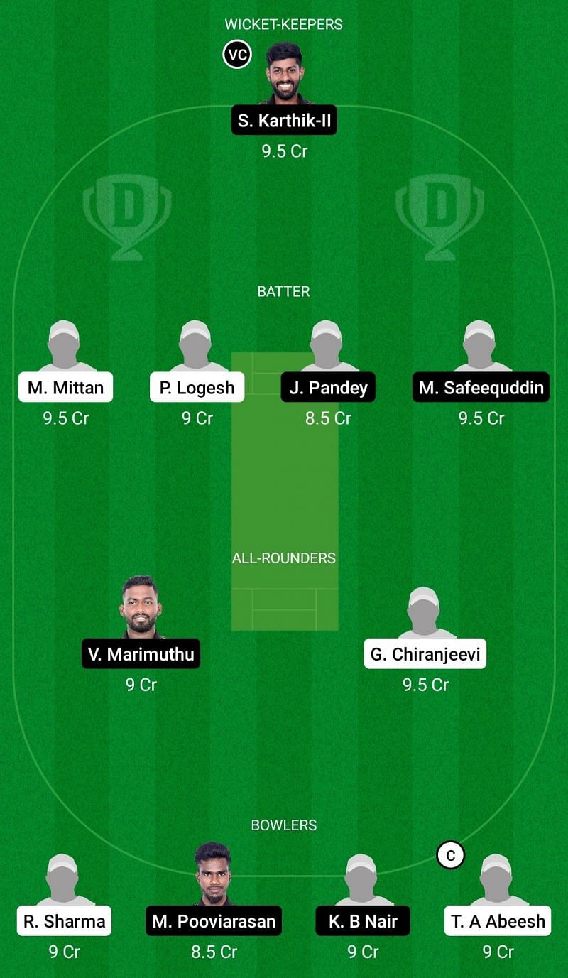Fantasy Suggestion #1: S Karthik-II, Mohit Mittan, Logesh P, Jay Pandey, Mohamed Safeequddin, Vikneshwaran Marimuthu, G Chiranjeevi, Raghu Sharma, M Pooviarasan, Karthik B Nair, T A Abeesh