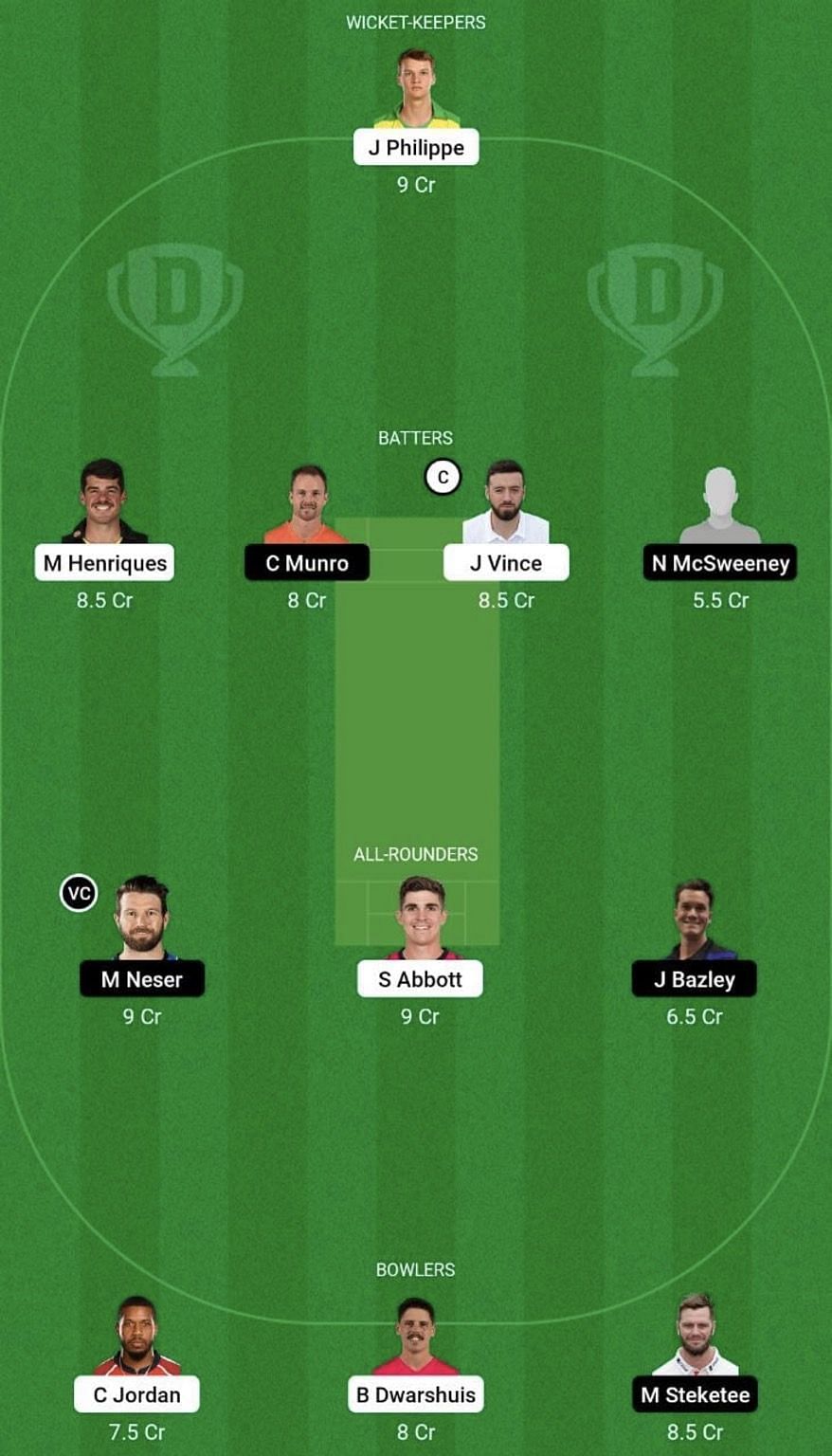 Josh Philippe (wk), Kurtis Patterson, James Vince, Moises Henriques (c), Jordan Silk, Daniel Christian, Hayden Kerr/Jackson Bird, Chris Jordan, Sean Abbott, Ben Dwarshuis and Izharulhaq Naveed.