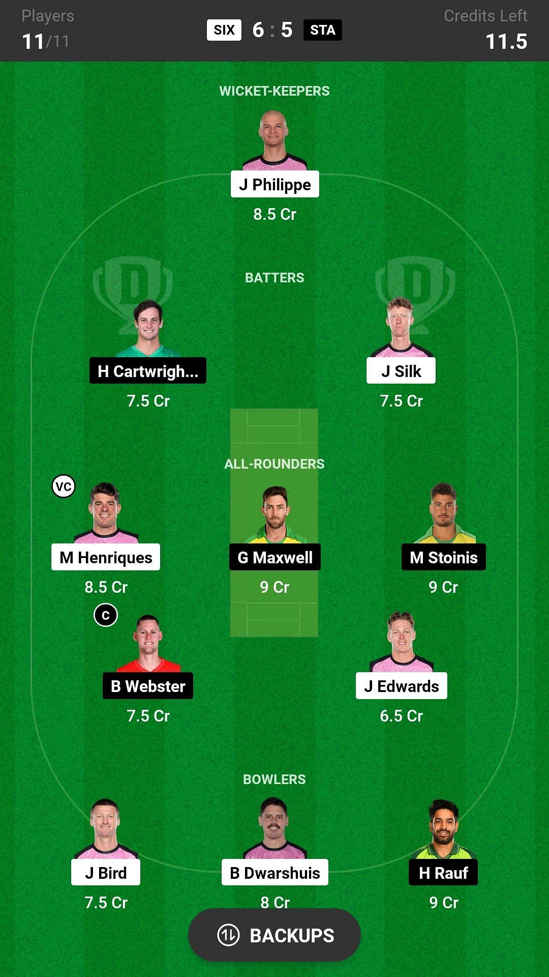B Webster and M Henriques are the best all-rounder picks for the Dream11 team, as they are batting in the middle order and also completing their quota of overs. G Maxwell is another good pick for today's nail-biting match.