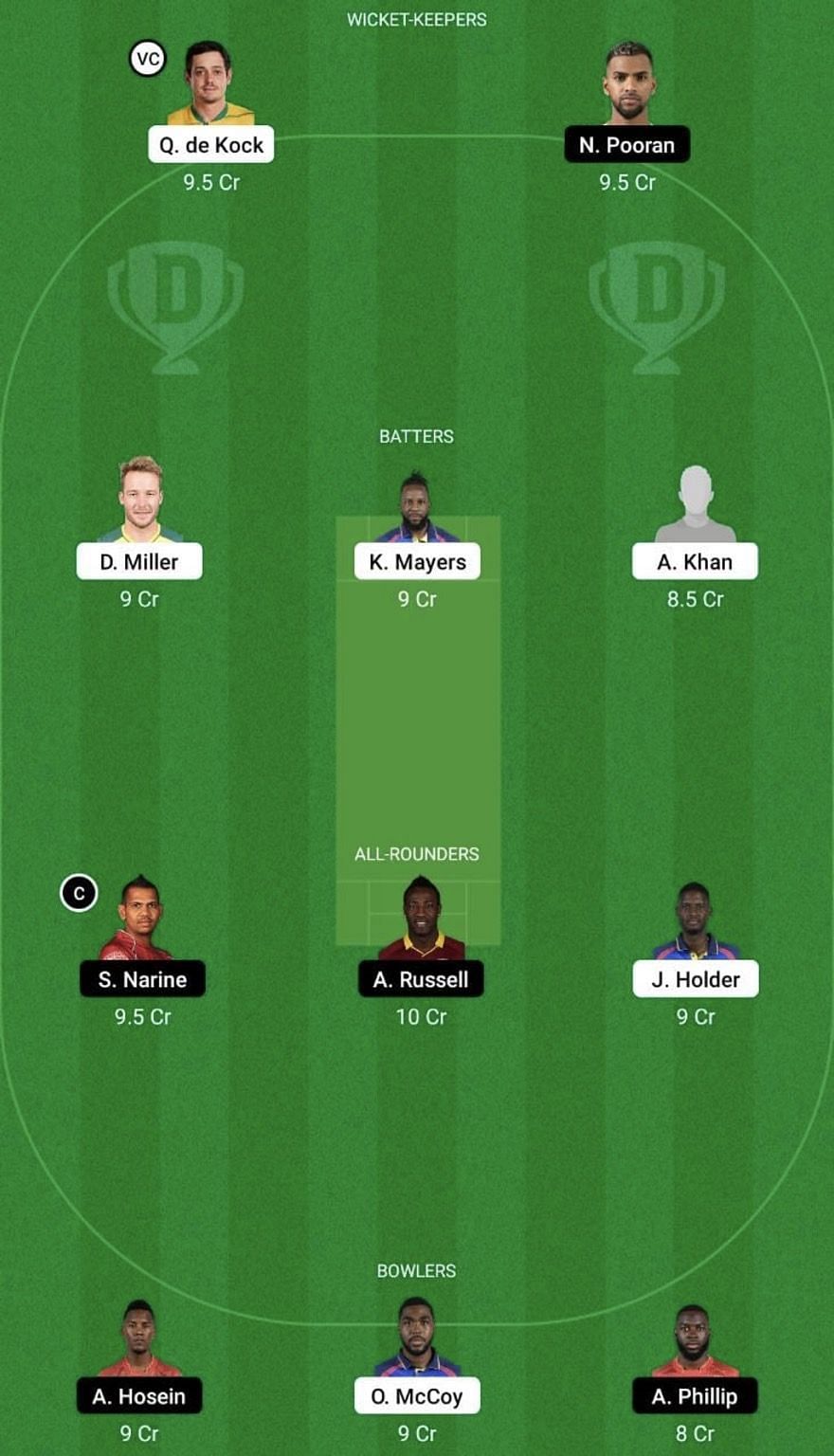 Kyle Mayers, Rakheem Cornwall, Quinton de Kock (wk), Azam Khan, David Miller (c), Harry Tector, Jason Holder, Corbin Bosch, Obed McCoy, Joshua Bishop and Oshane Thomas/Ramon Simmonds.