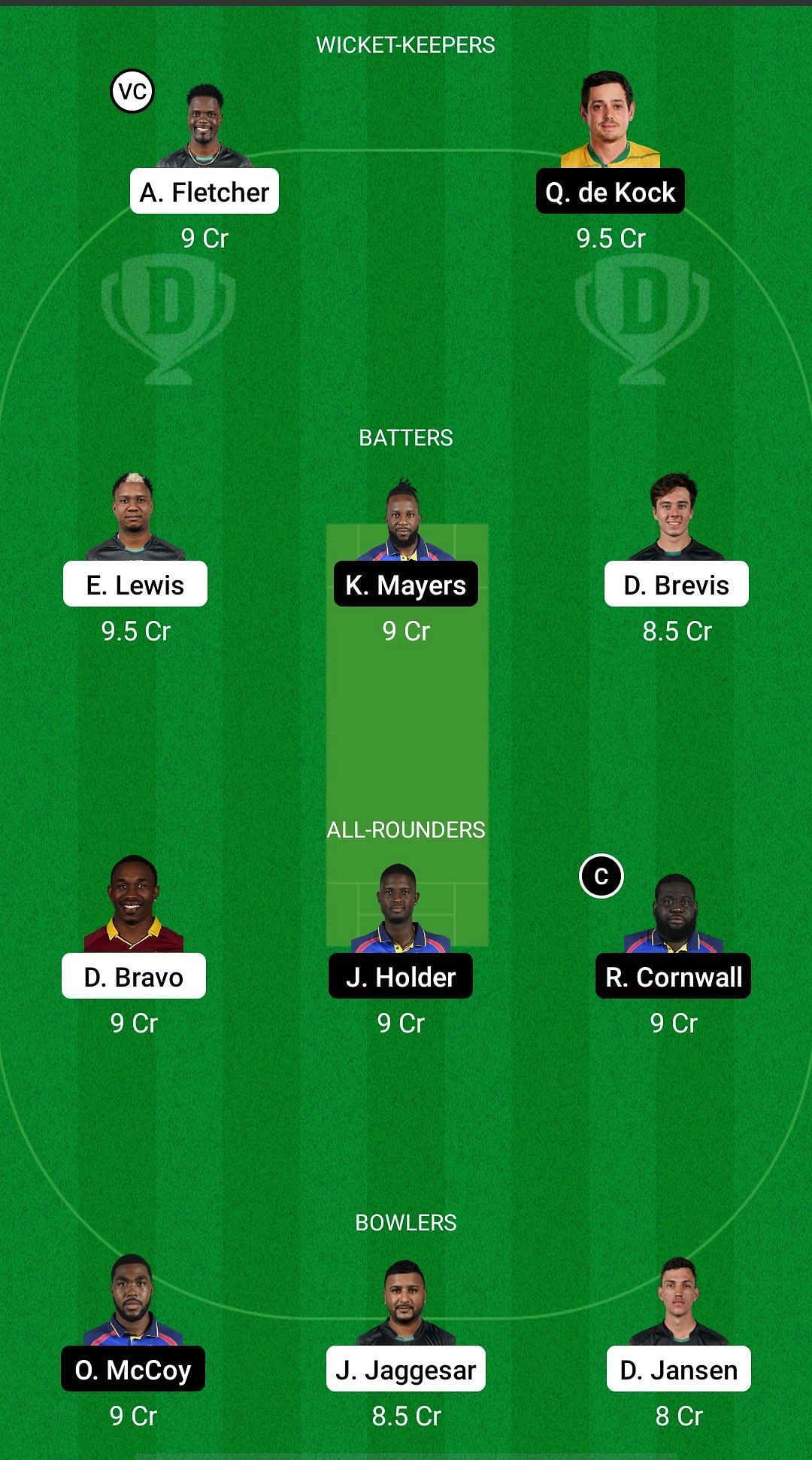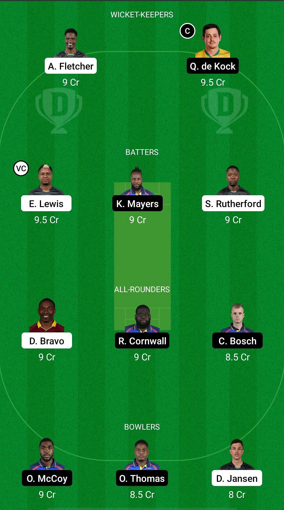 Jason Holder (C), Corbin Bosch, Rahkeem Cornwall, Quinton de Kock (WK), Kyle Mayers, Obed McCoy, David Miller, Mujeeb Ur Rahman, Harry Tector, Oshane Thomas, Devon Thomas.