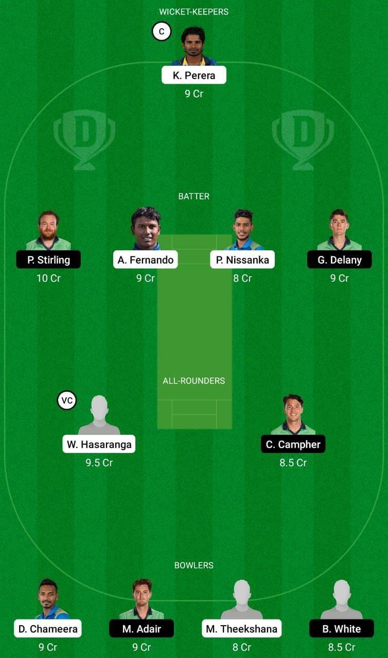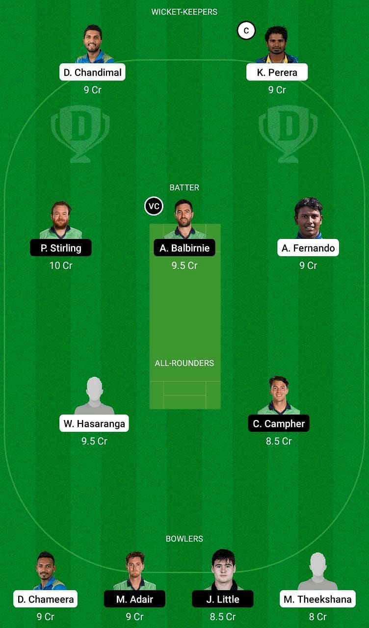 Fantasy Suggestion #1: Dinesh Chandimal, Kusal Perera, Paul Stirling, Andy Balbirnie, Avishka Fernando, Wanindu Hasaranga, Curtis Campher, Dushmantha Chameera, Mark Adair, Josh Little and Maheesh Theekshana