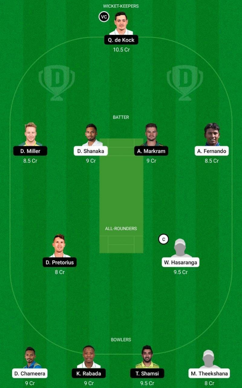 Fantasy Suggestion #1: Quinton de Kock, Aiden Markram, Dasun Shanaka, Avishka Fernando, David Miller, Wanindu Hasaranga, Dwaine Pretorius, Maheesh Theekshana, Dushmantha Chameera, Kagiso Rabada and Tabraiz Shamsi