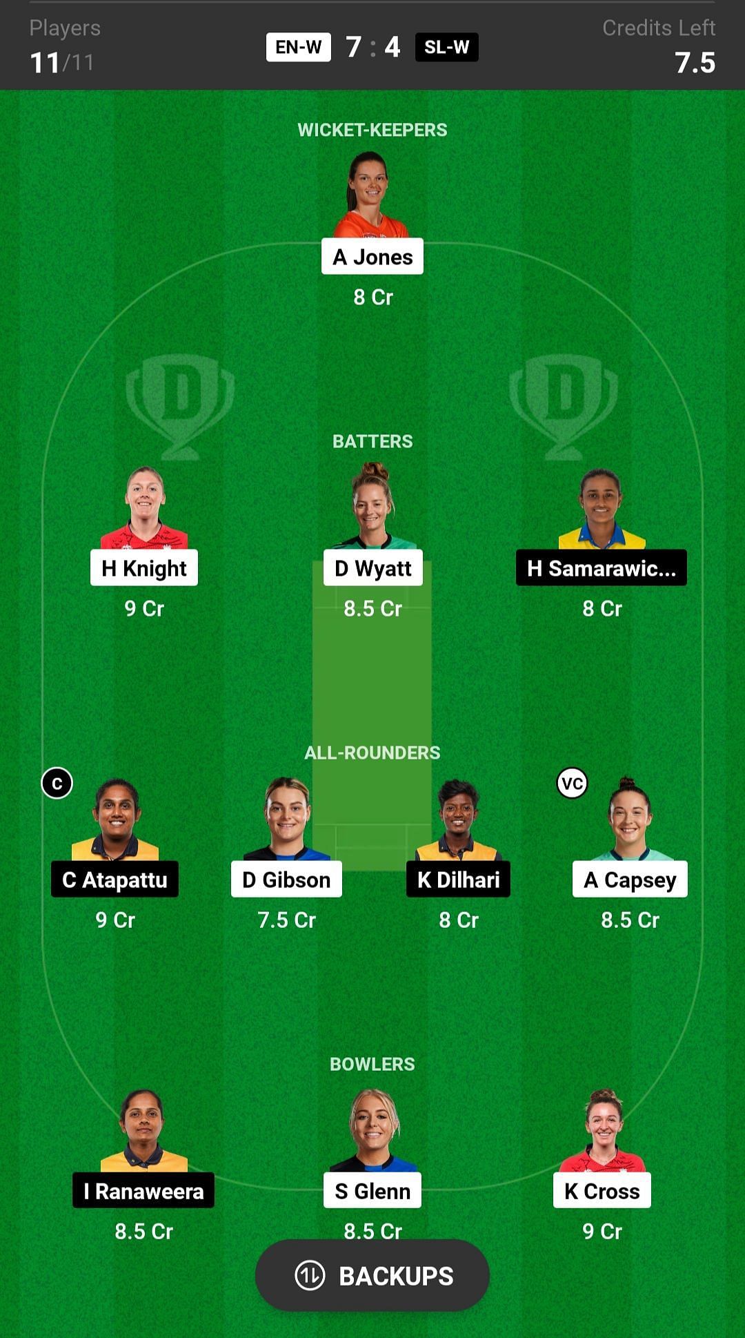 D Wyatt and H Knight are the two best batter picks for the Dream11 team. H Samarawickrama played exceptionally well in the last series, so she is also a good pick for today's Dream11 fantasy team.