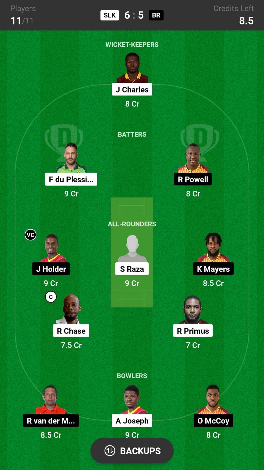 Faf du Plessis (c), K Melius, R Primus, Matthew Forde, Sikandar Raza, Roston Chase, Sean Williams, Johnson Charles (wk), Alzarri Joseph, P Hatzoglou, C Sole